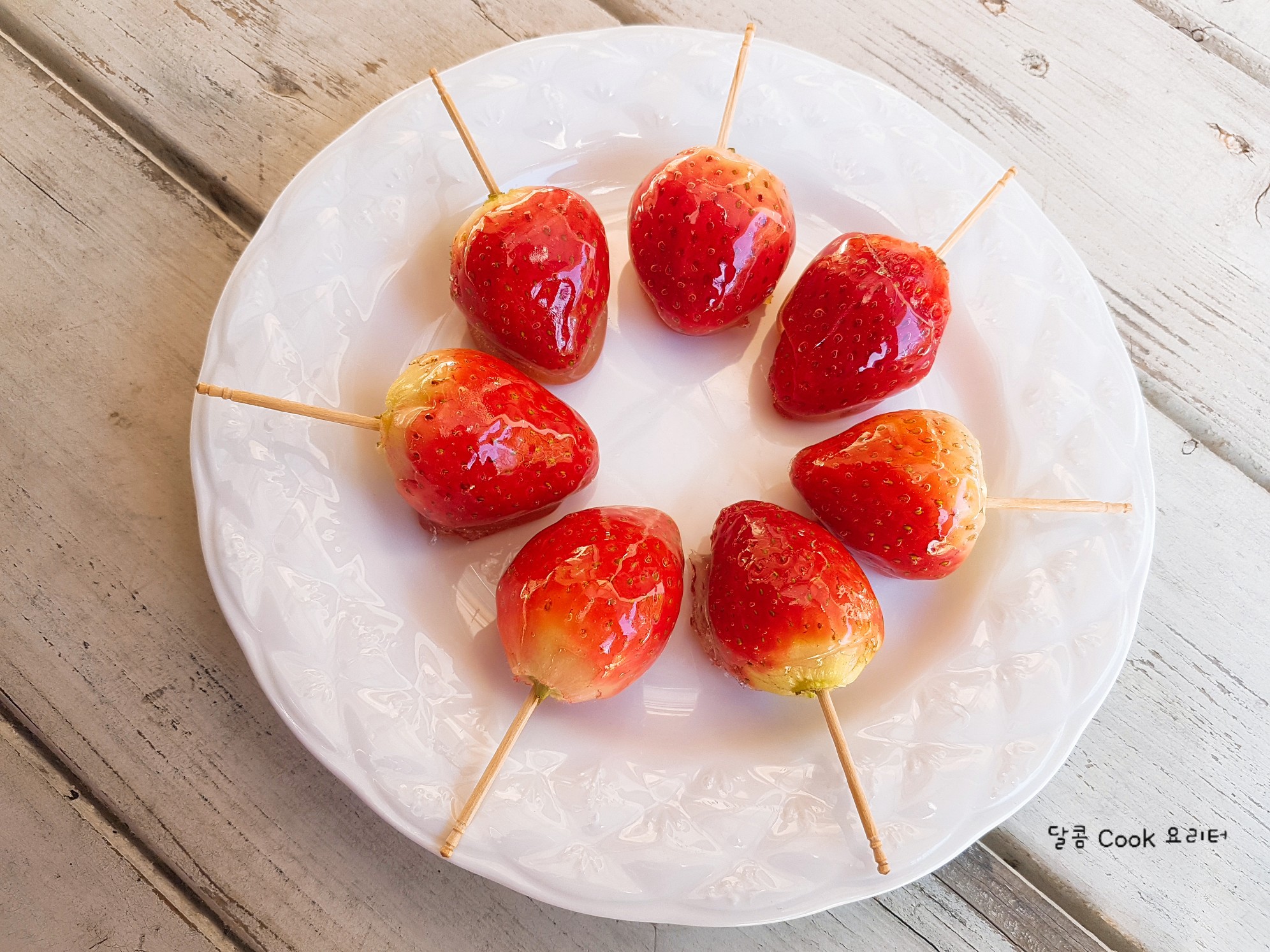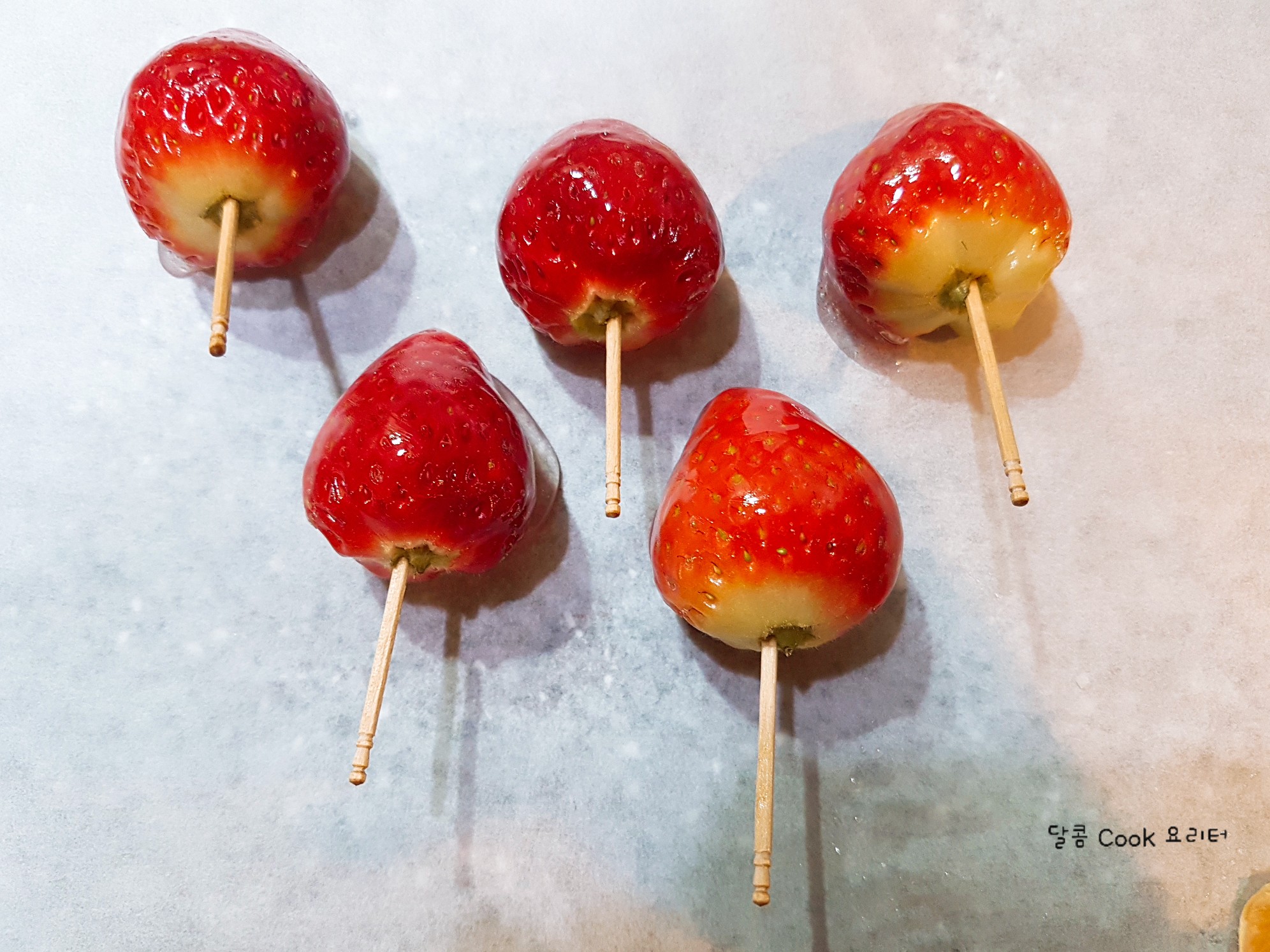 만약 아직 완성되지 않은 시럽을 딸기에 코팅하면 찐득찐득 굳지 않아서 먹을 수가 없어요.