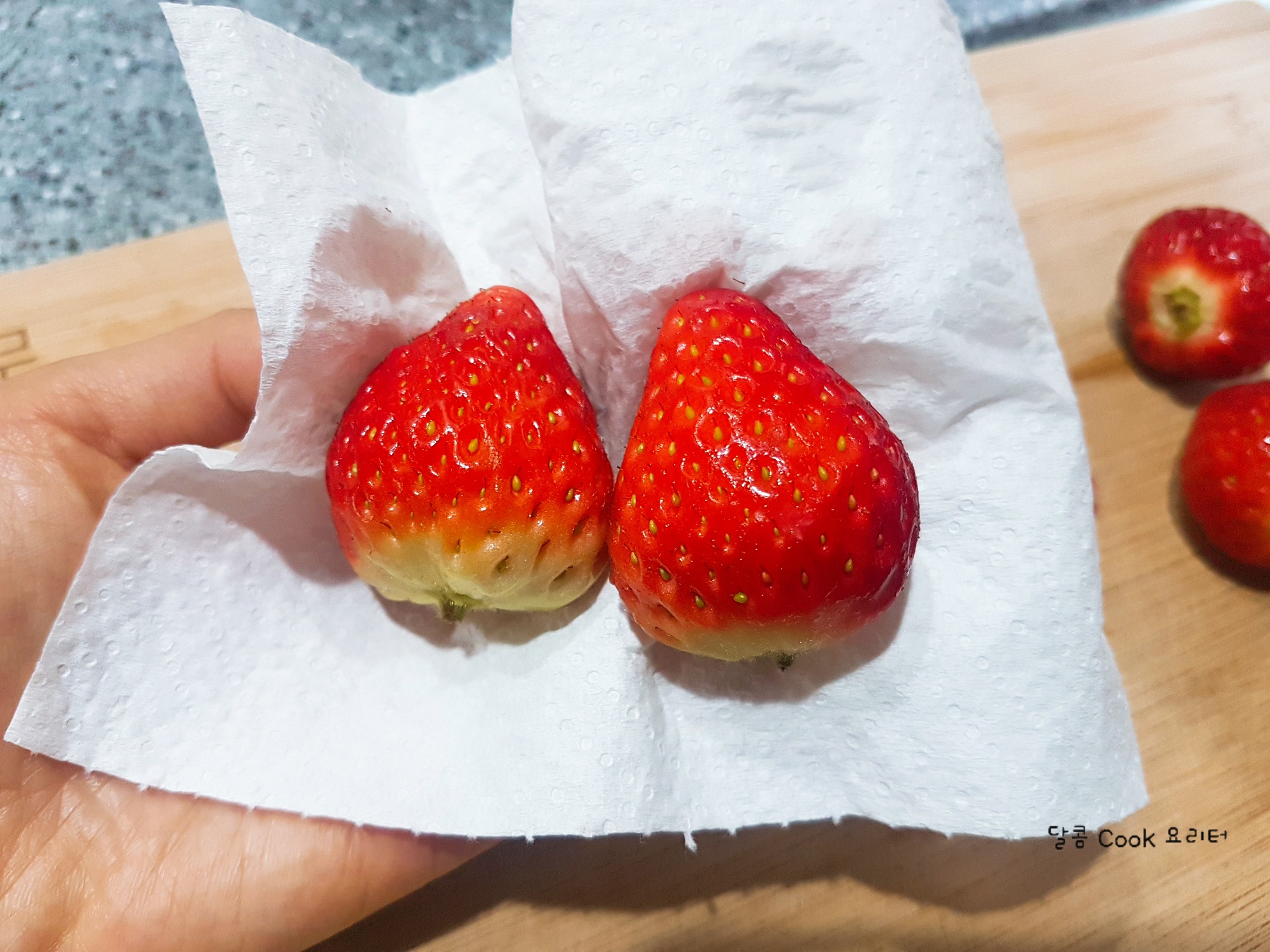 우선 딸기는 깨끗이 씻은 후 꼭지를 제거해줍니다.