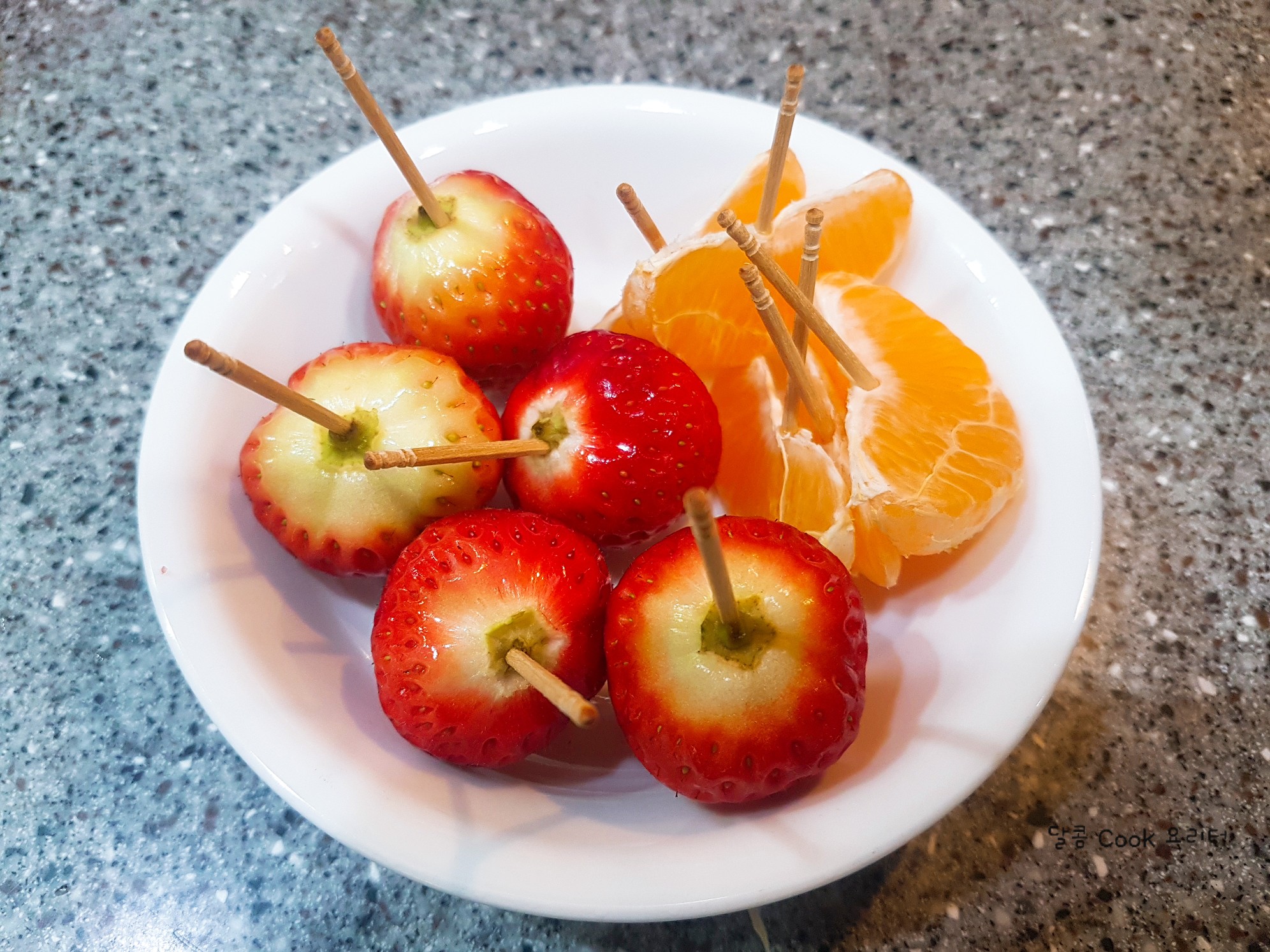 꼭지 제거 후 꼬치를 이용해 딸기를 꽂아줍니다.