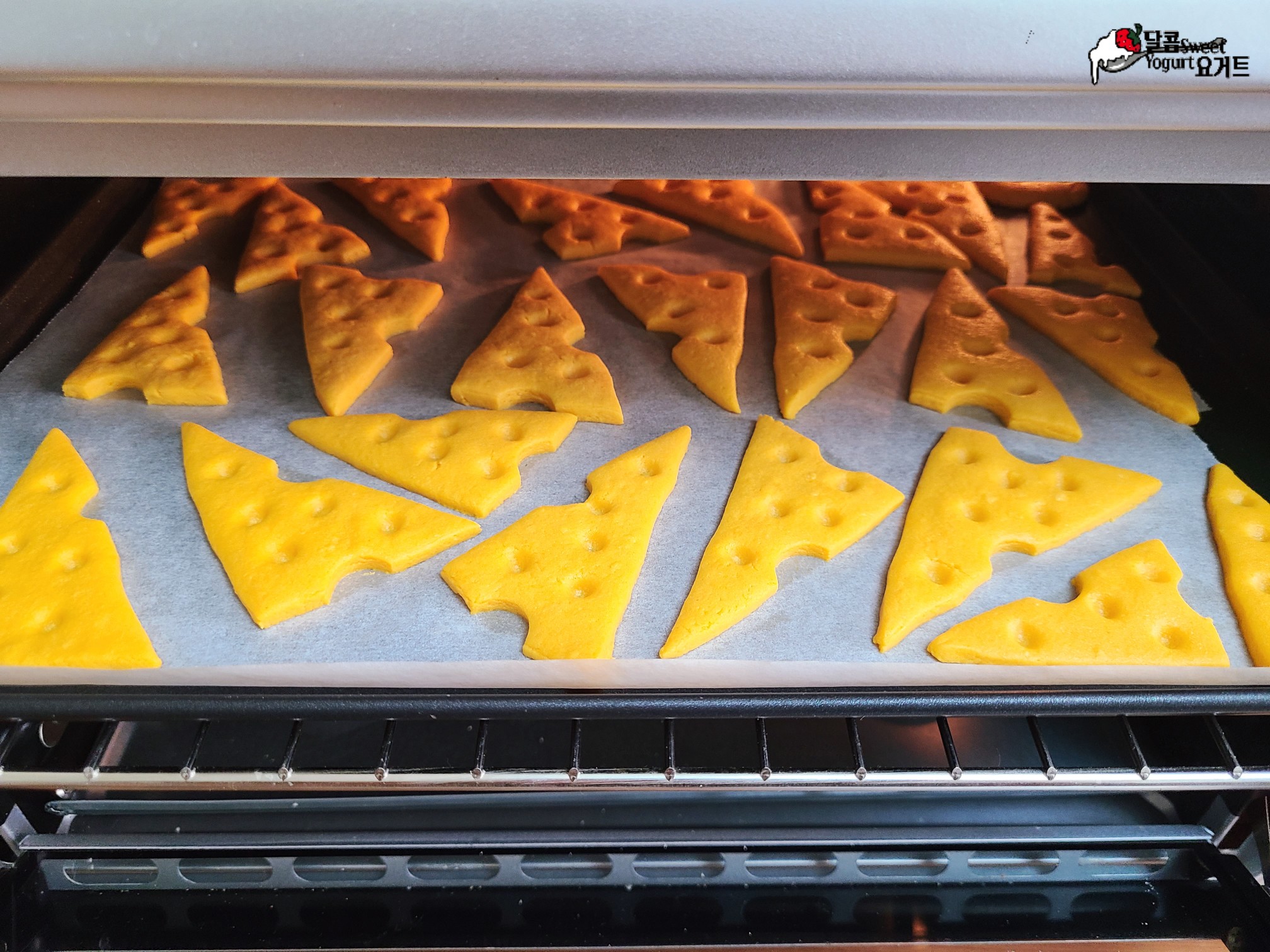 잘 구워졌다면 최종 완성이 되는 치즈 모양의 황치즈쿠키입니다.