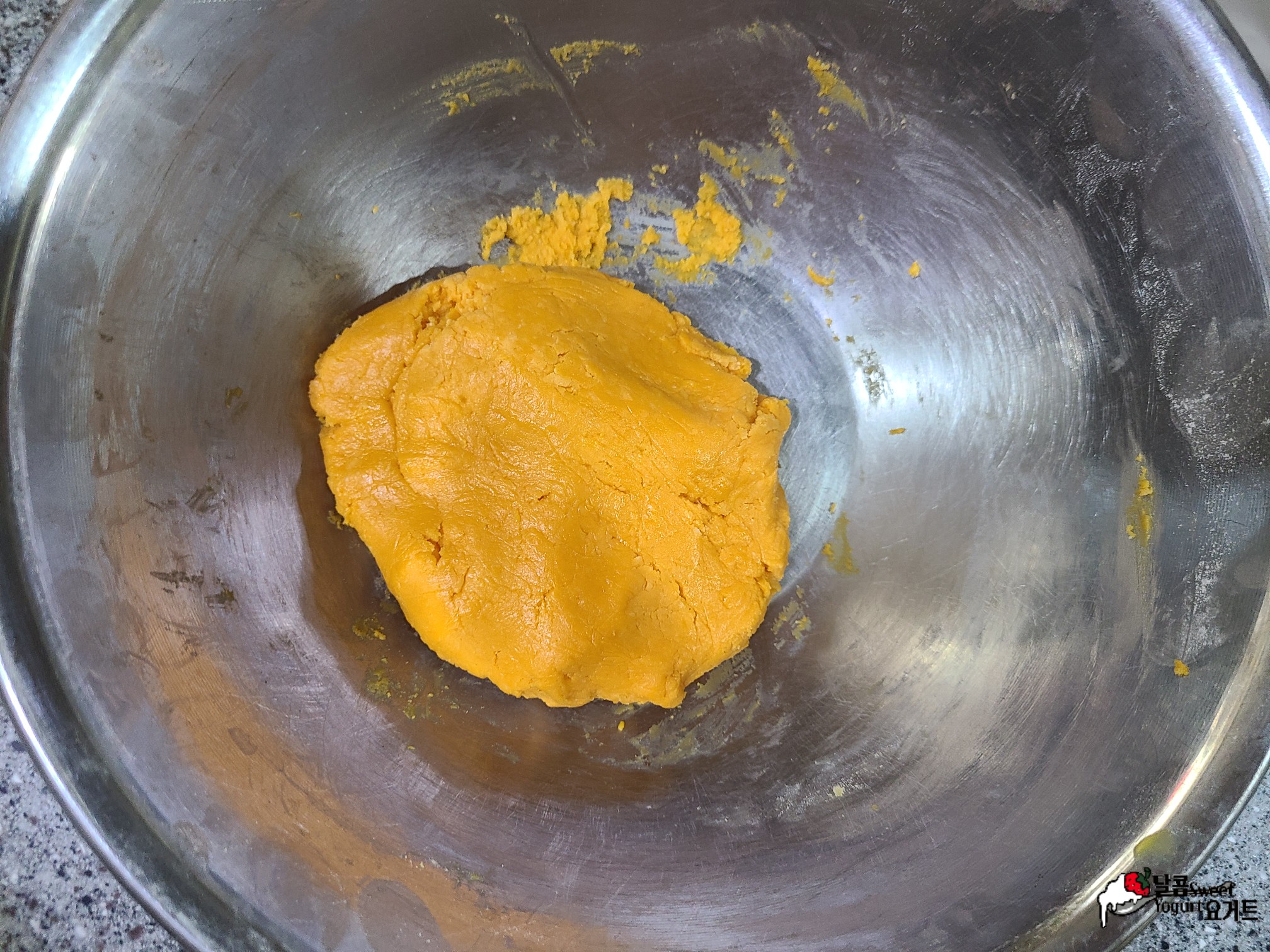 날가루가 보이지 않을 때까지 잘 섞은 후 뭉쳐 반죽을 완성해줍니다.