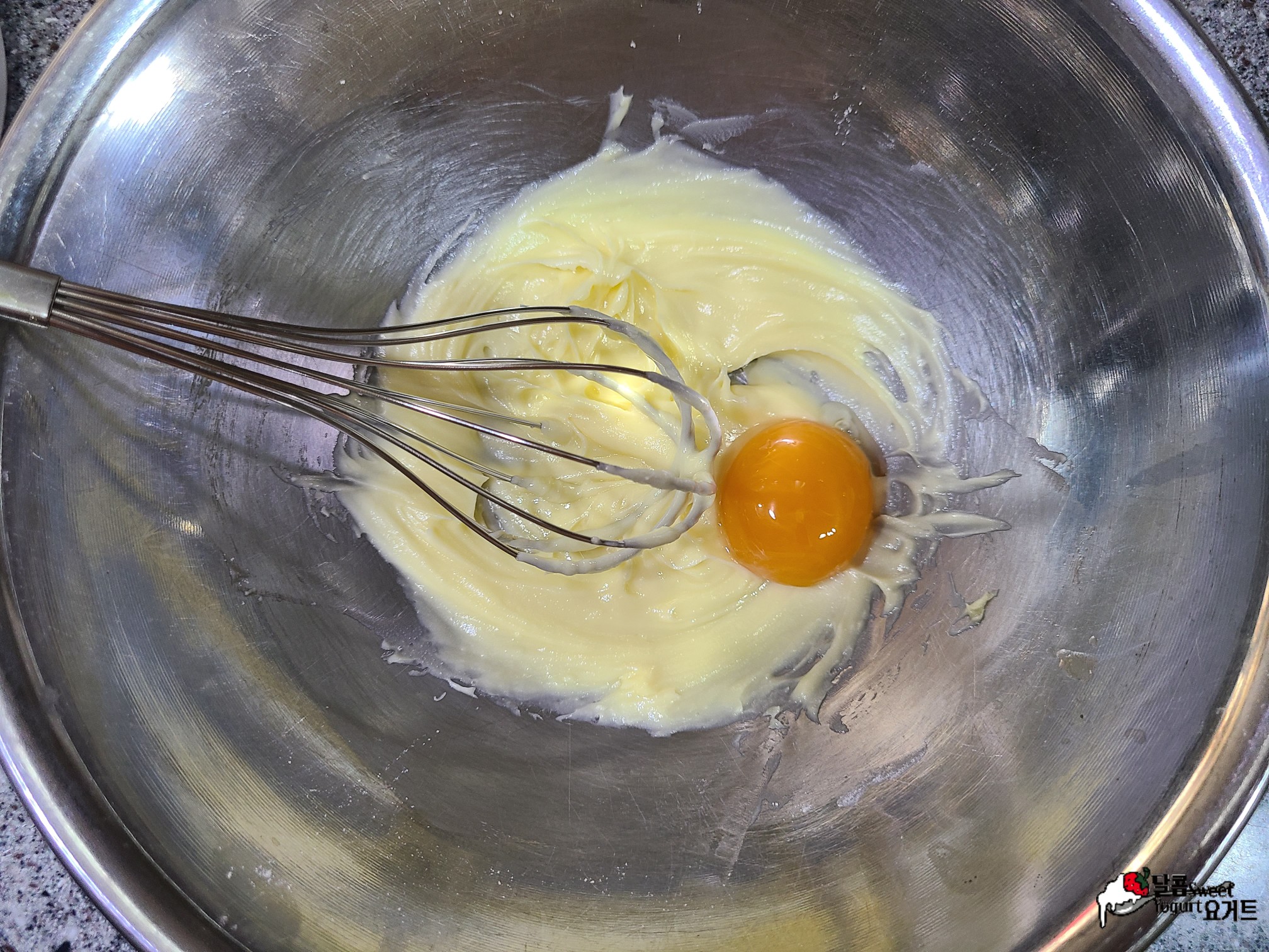 실온의 계란 노른자를 넣고 잘 섞어주세요.