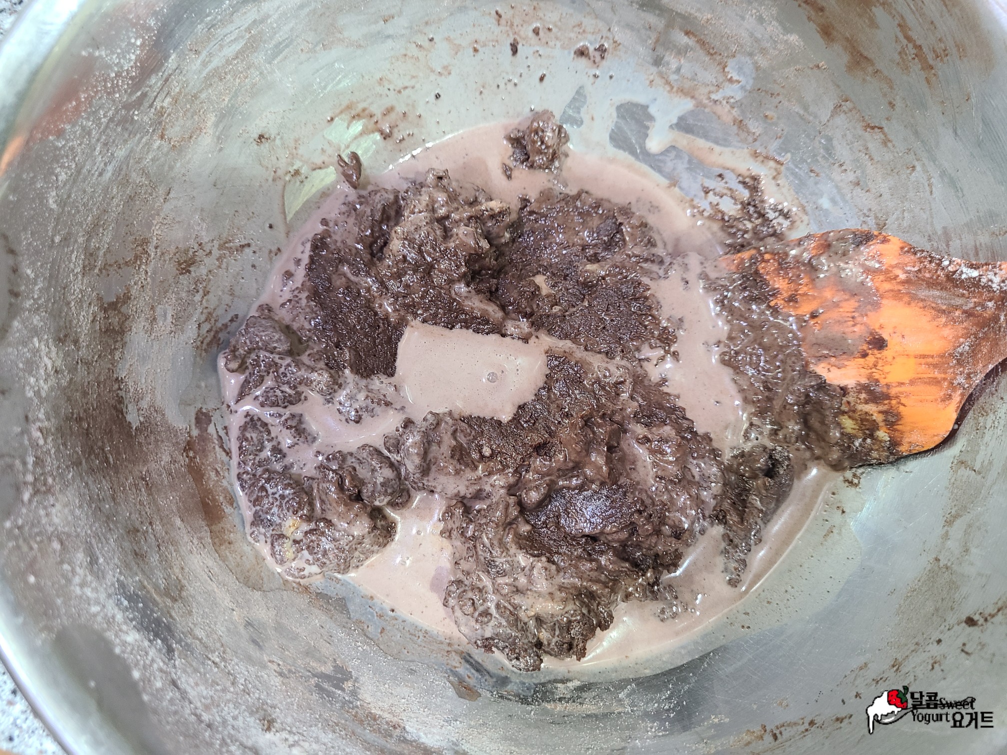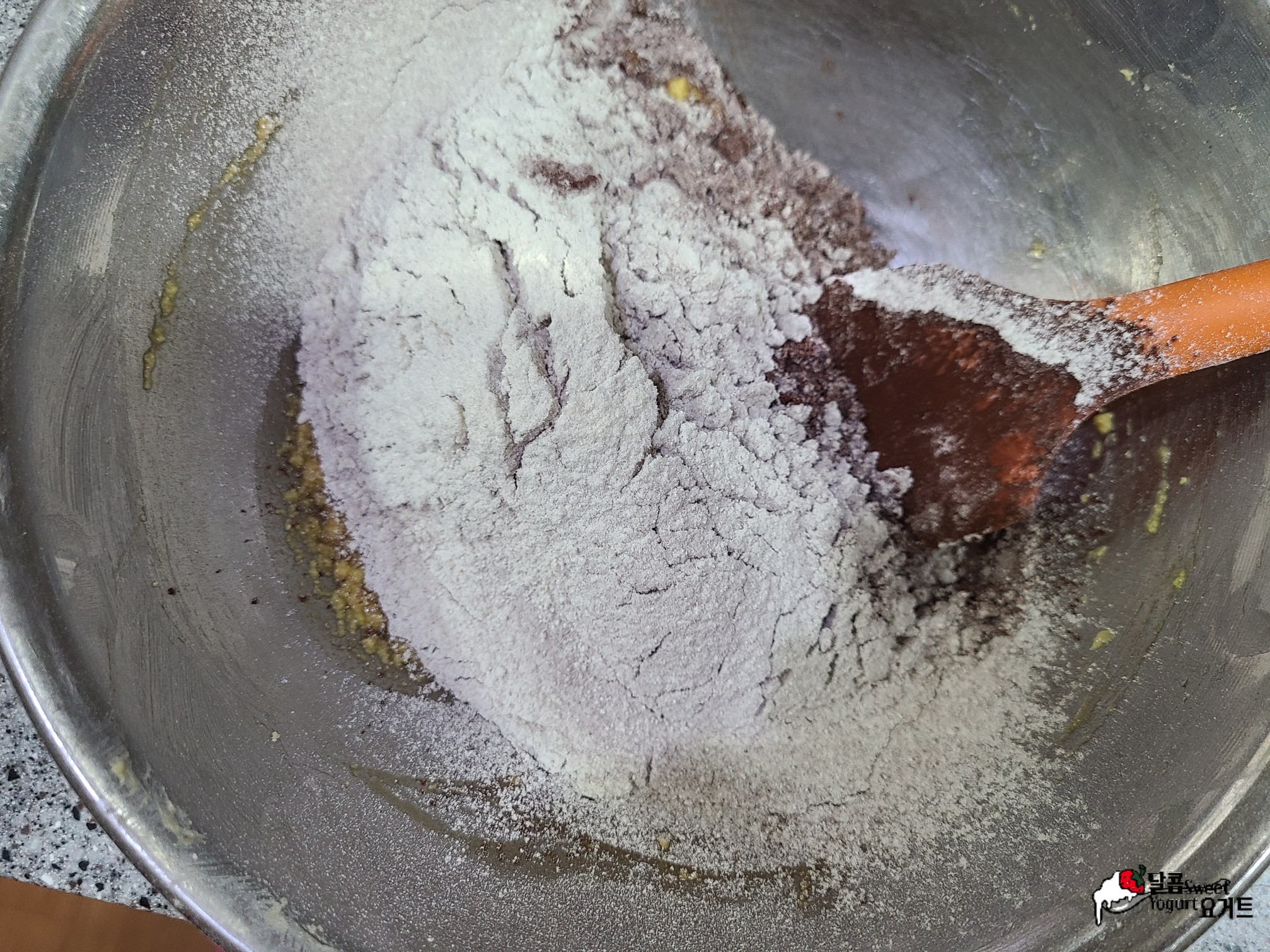 박력분 100g, 코코아 파우더 25g, 베이킹파우더 2g을 체질하고 반죽을 대충 섞어줍니다.