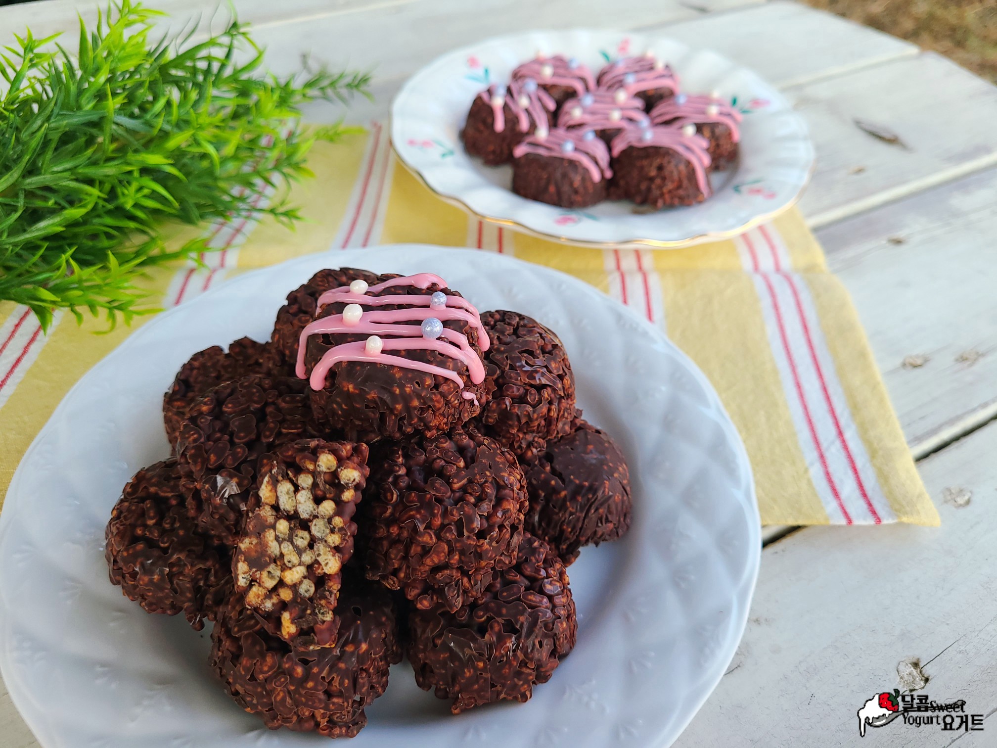 조금은 심심해 보일 수 있는 크런치 초콜릿 위로 코팅용 딸기 초콜릿과 스프링클을 이용해 가볍게 꾸며보았습니다.