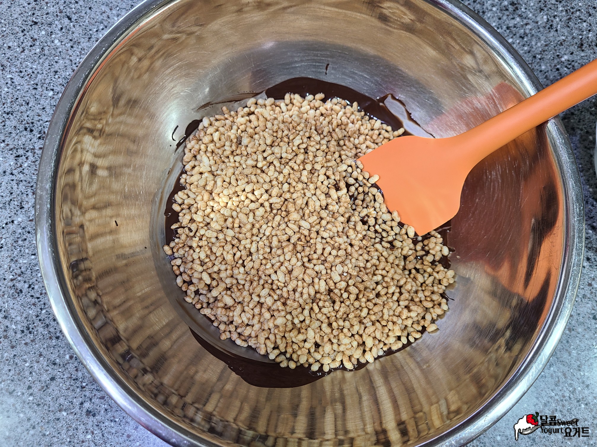초콜릿이 완전하게 녹았다면 볶은 통현미를 넣고 골고루 잘 섞어줍니다.