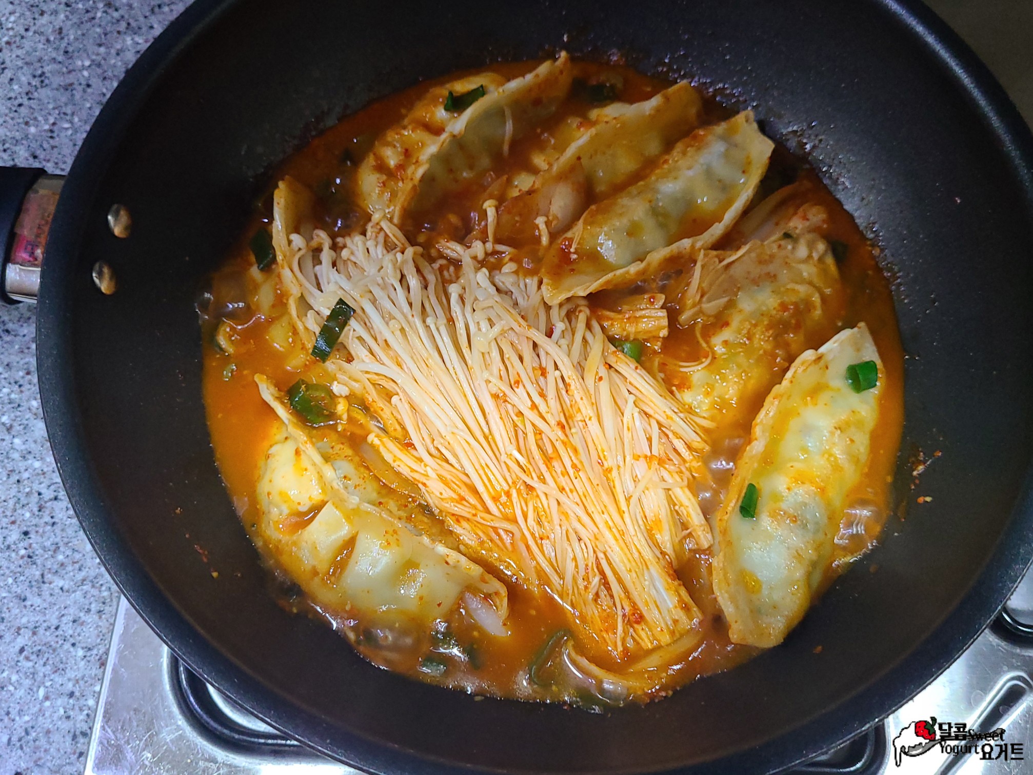 만두는 노릇노릇하게 구워주어야 양념장을 넣고 끓일 때 국물의 맛이 더 좋아집니다.