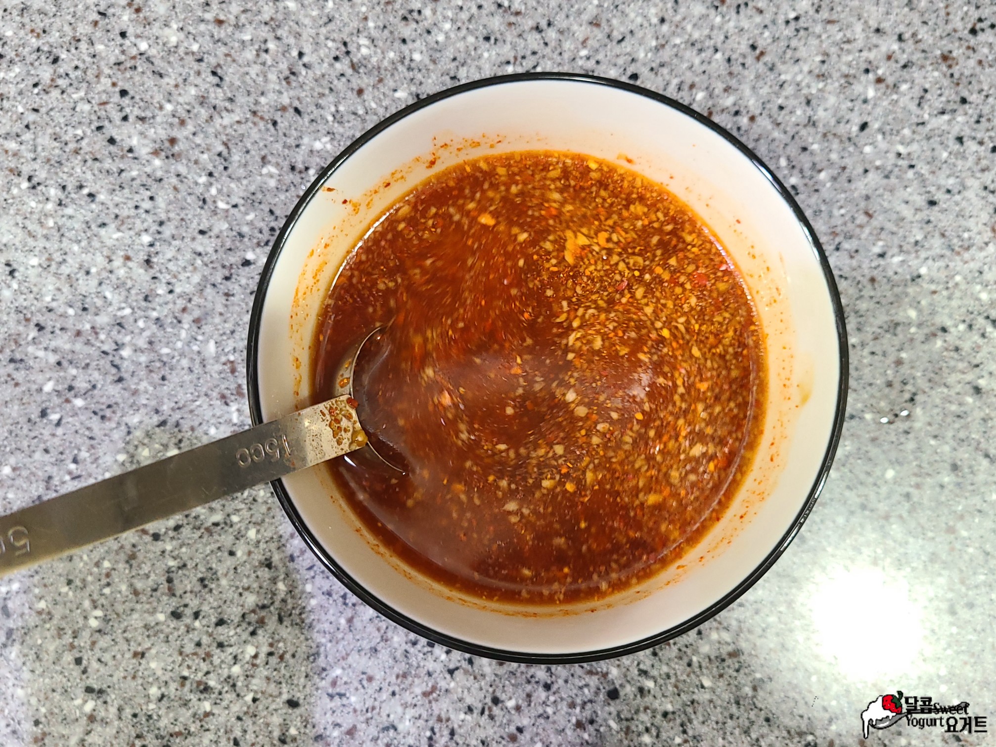 군만두조림 양념장으로 간장 1큰술, 굴소스 1큰술, 고춧가루 2큰술, 케첩 1큰술, 설탕 0.5큰술, 다진 마늘 1큰술을 넣고 섞어줍니다.