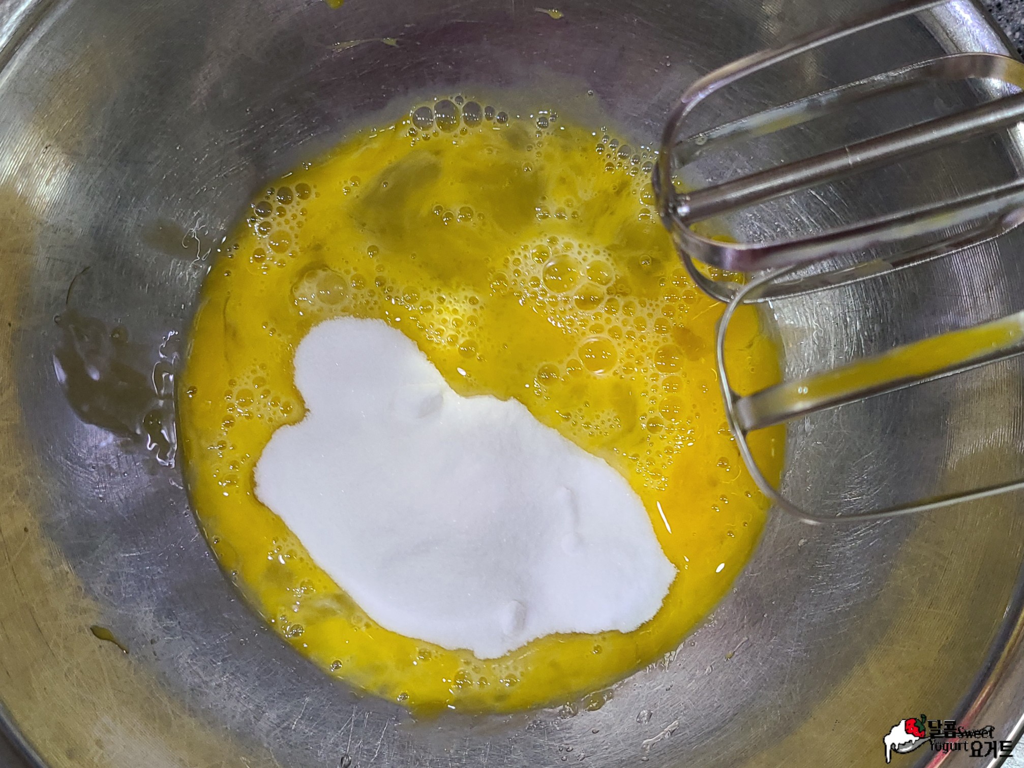 먼저 실온 계란 3개를 풀어주고 설탕 130g, 소금 1.5g을 넣고 섞어줍니다.