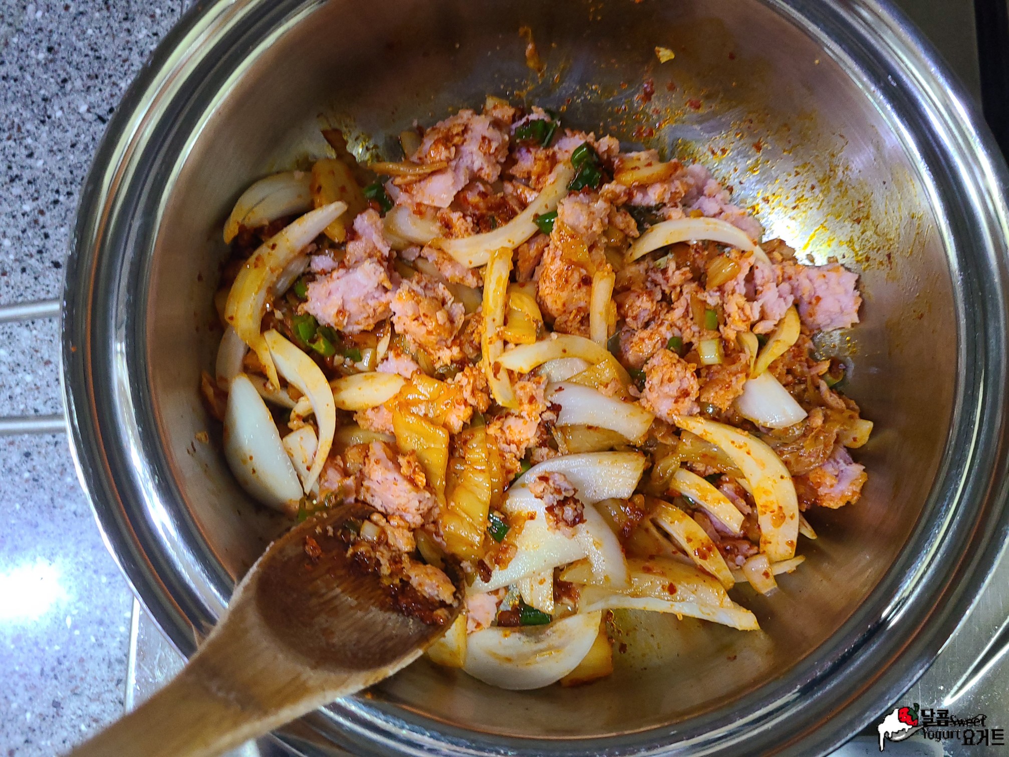 으깬 스팸과 양파를 넣고 가볍게 볶아줍니다.