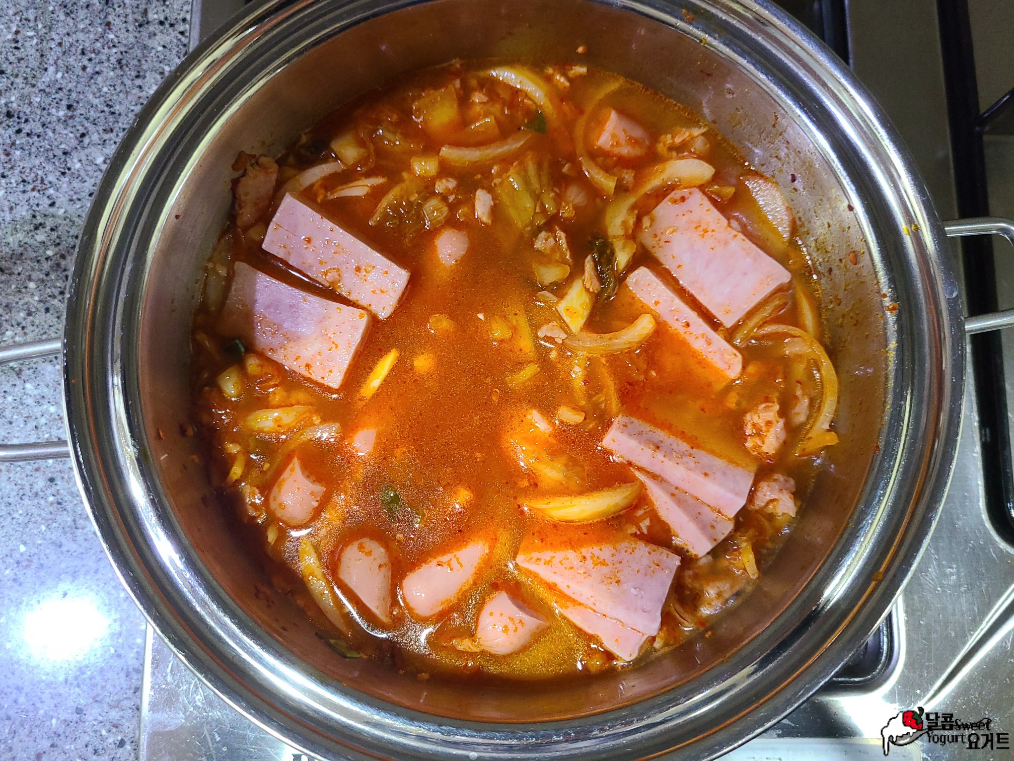 썰어놨던 스팸, 비엔나소시지를 넣고 센 불에서 끓여줍니다.