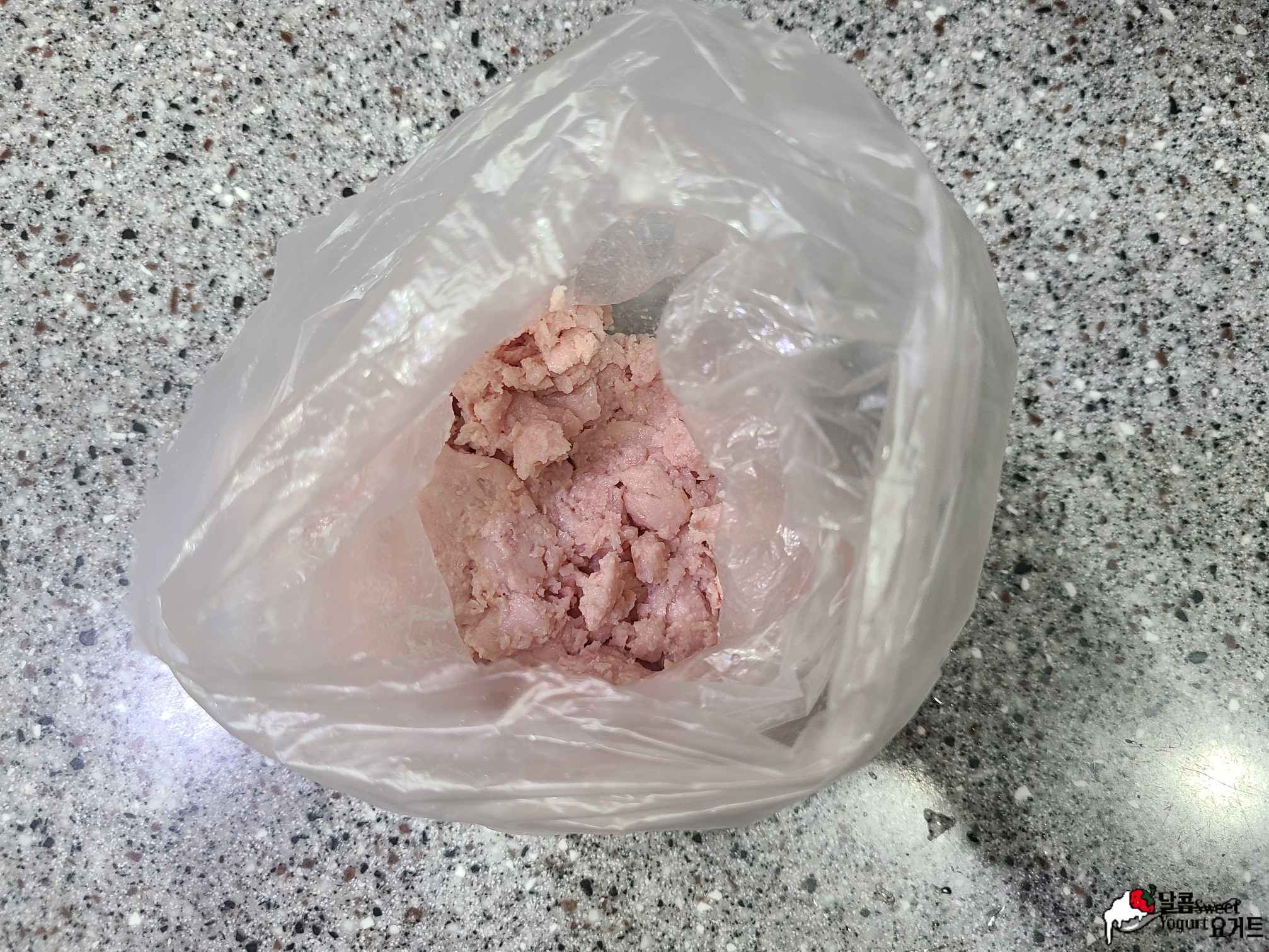 스팸 반 통(100g)을 준비해 비닐백에 넣어주고 으깨줍니다.