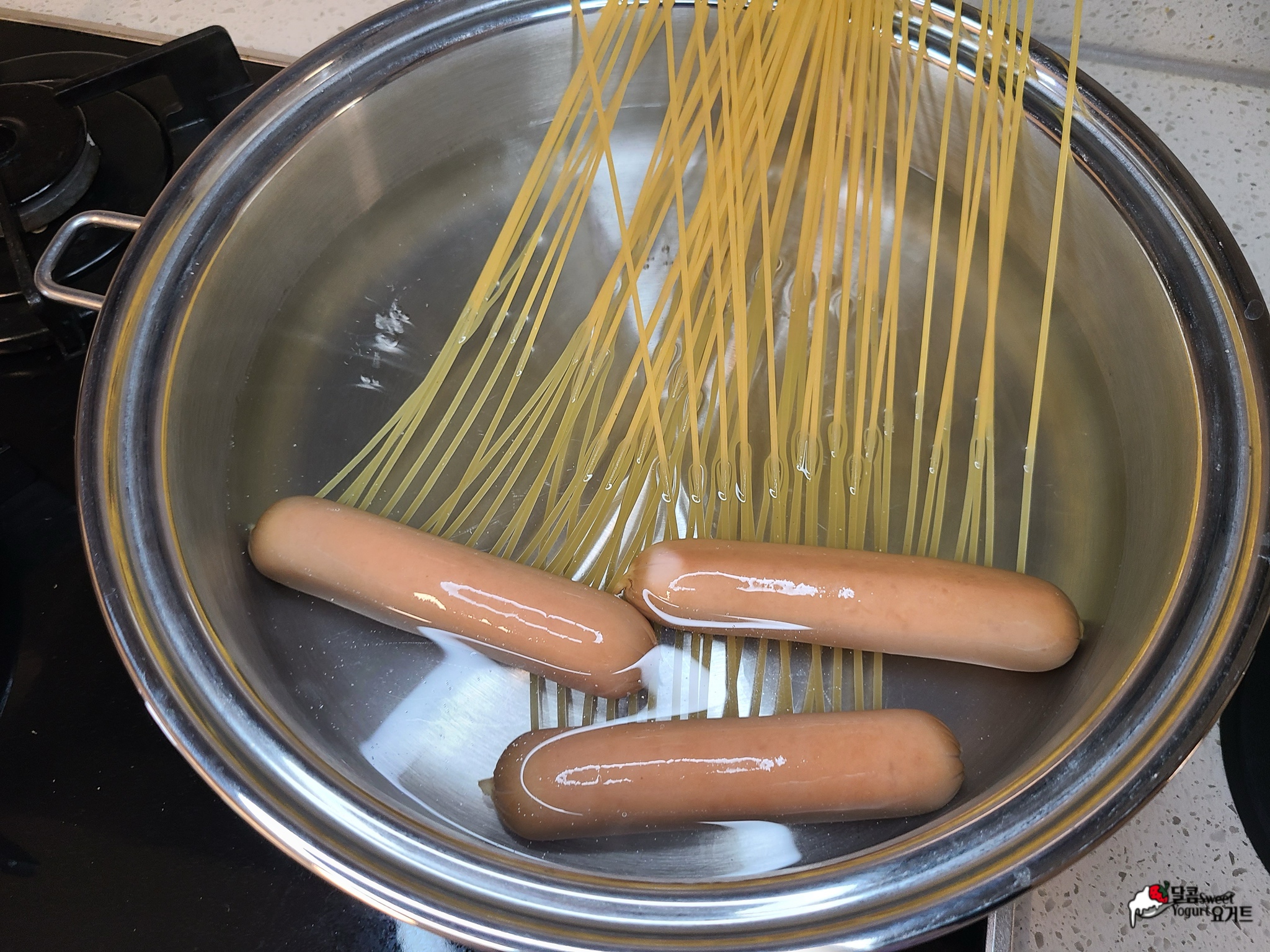 큰 레시피 없이 파스타면을 소세지에 콕콕 꽂아 삶아주면 끝이기에 요알못, 똥손도 손쉽게 만들 수 있는 메뉴.