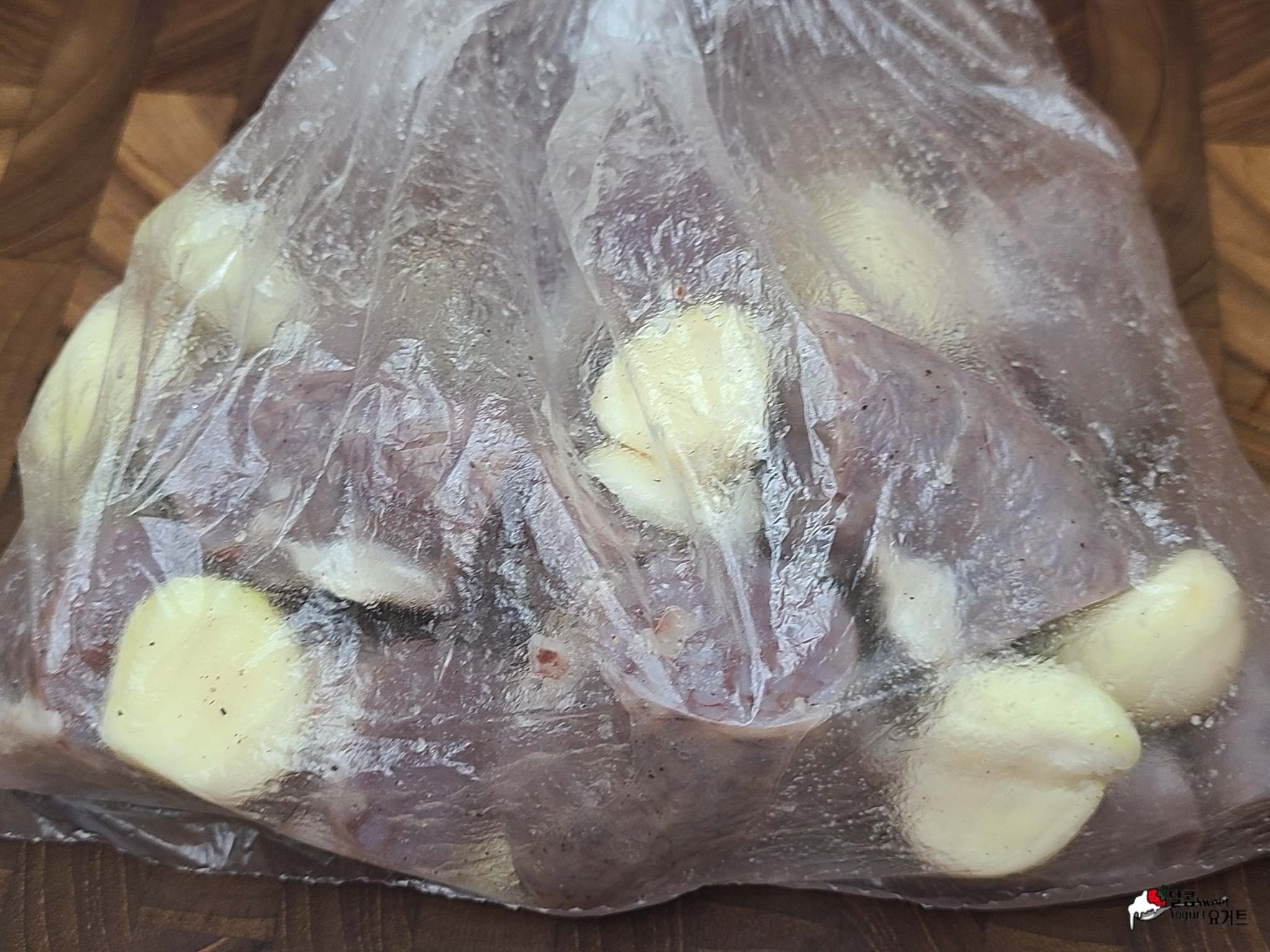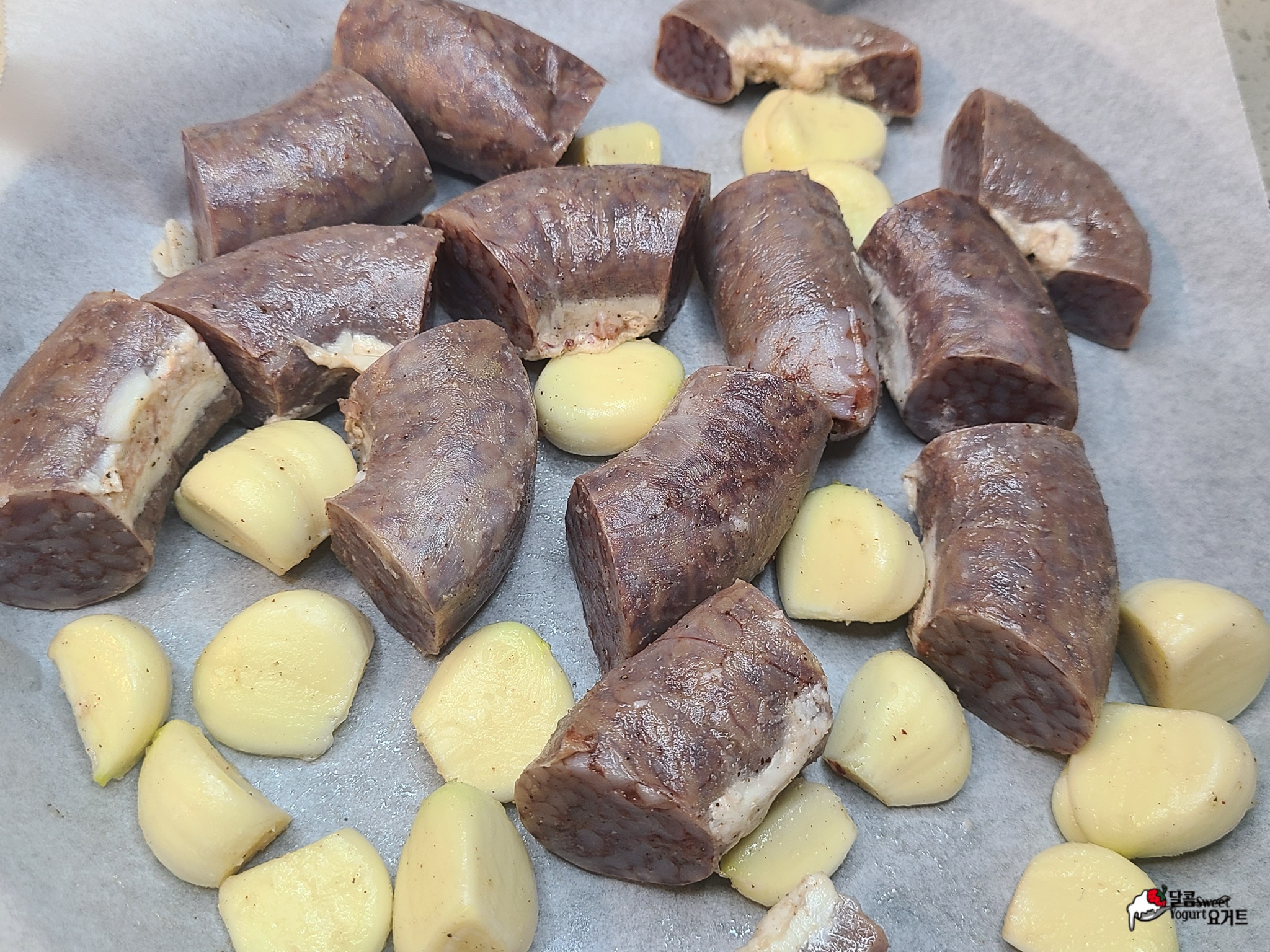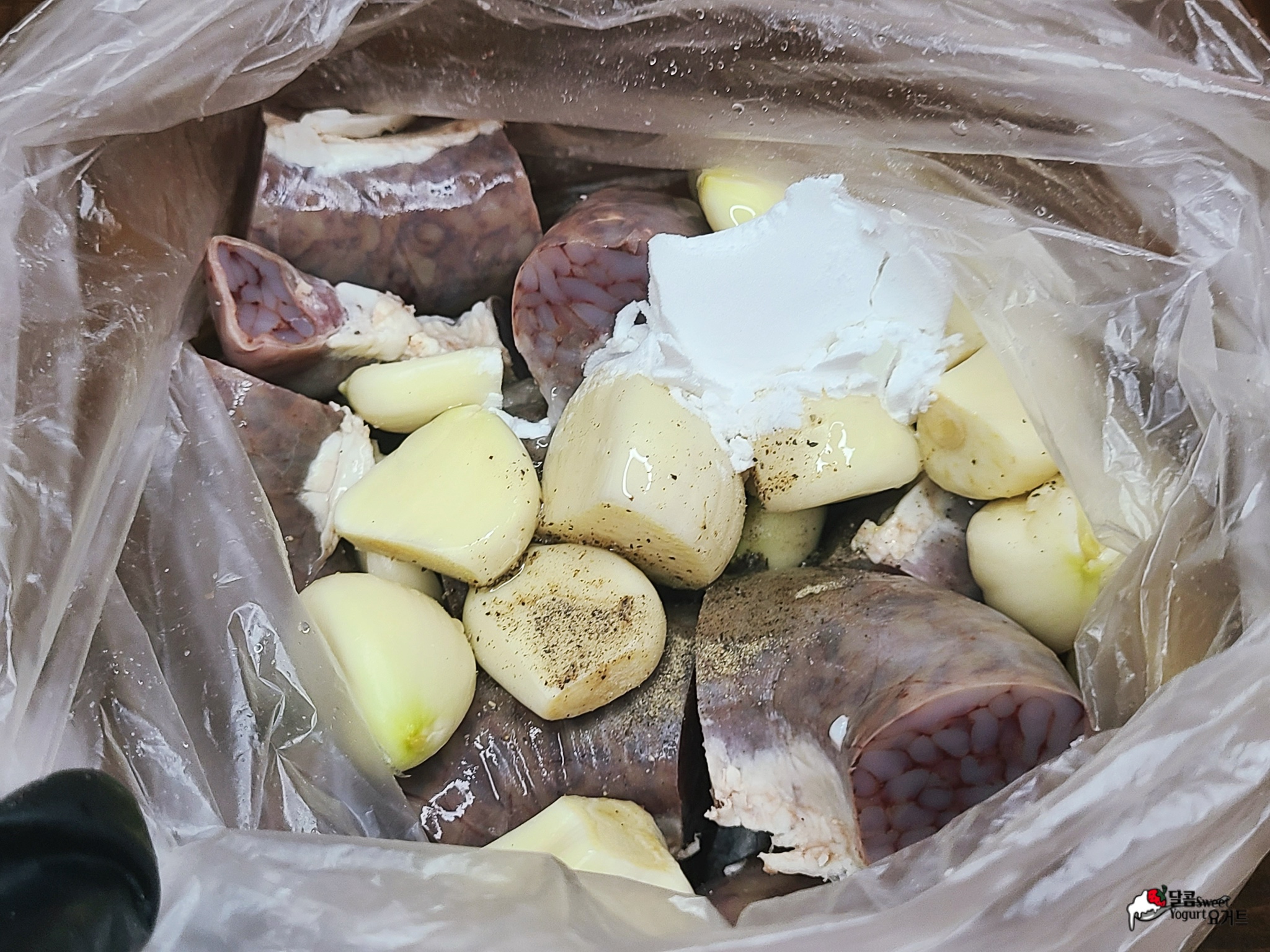 비닐봉지에 순대와 통마늘을 함께 넣어줍니다.