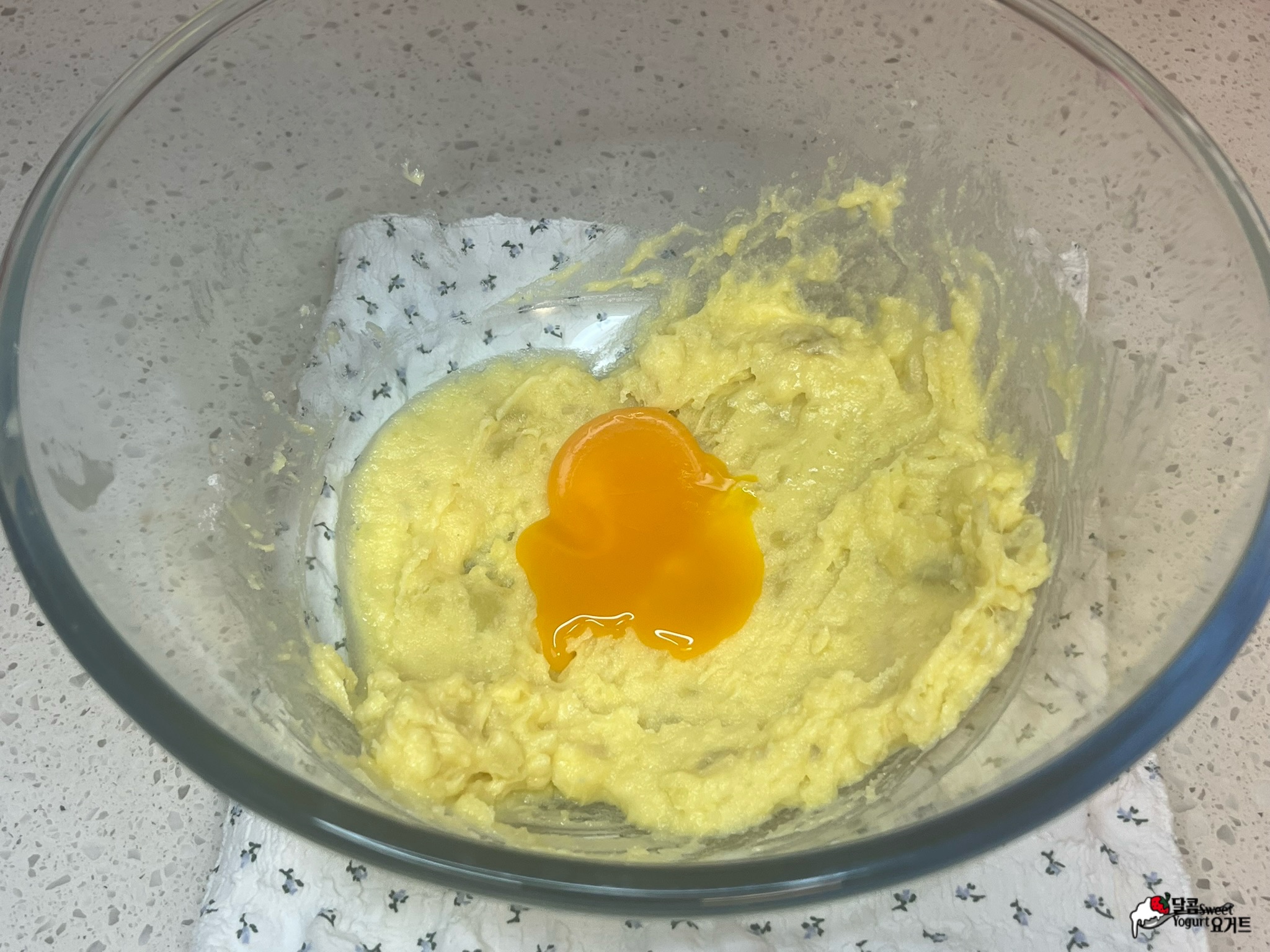 버터 60g, 설탕 40g 넣고 잘 섞어준 후 계란노른자 1개 넣고 섞어줍니다.