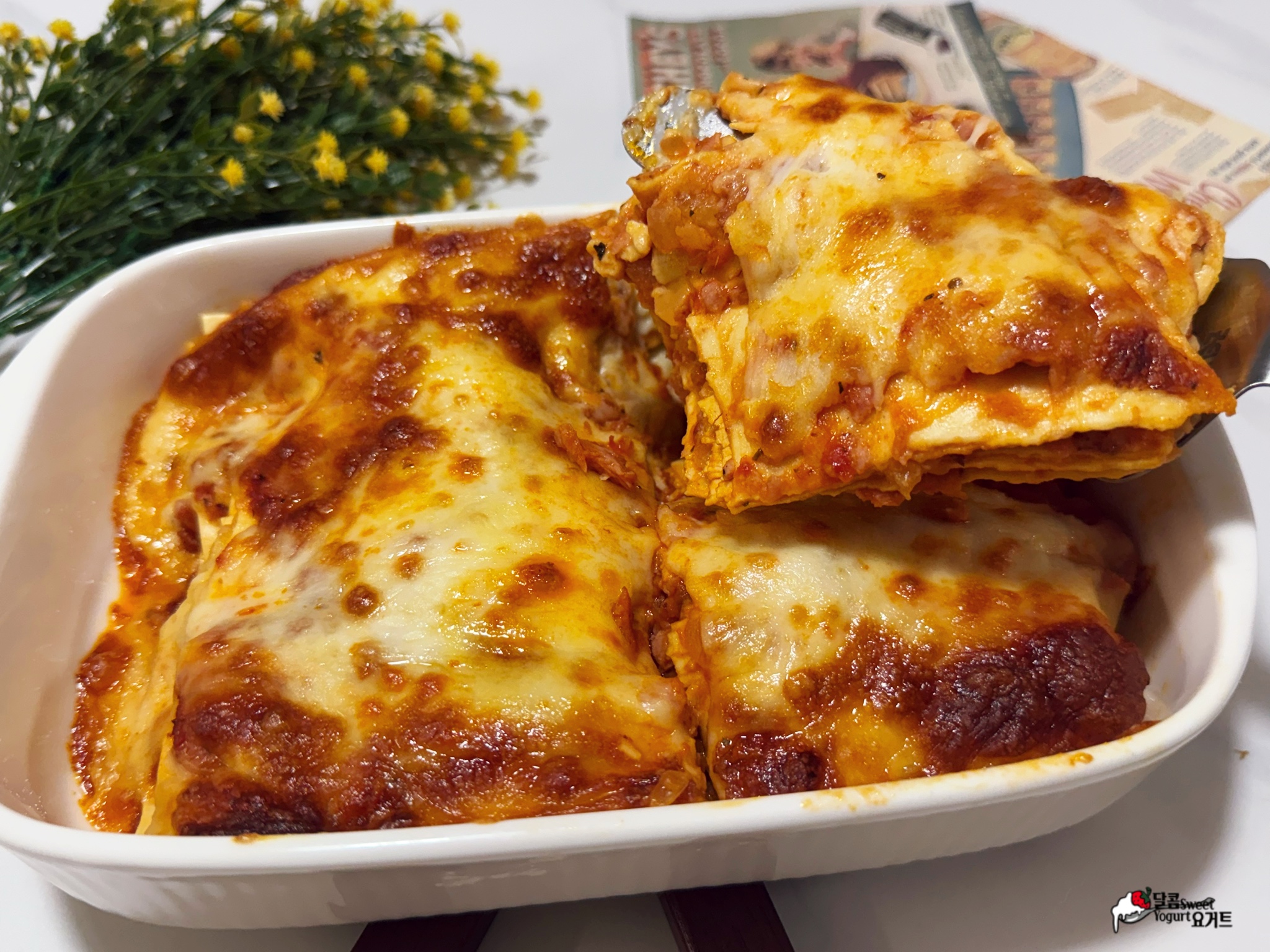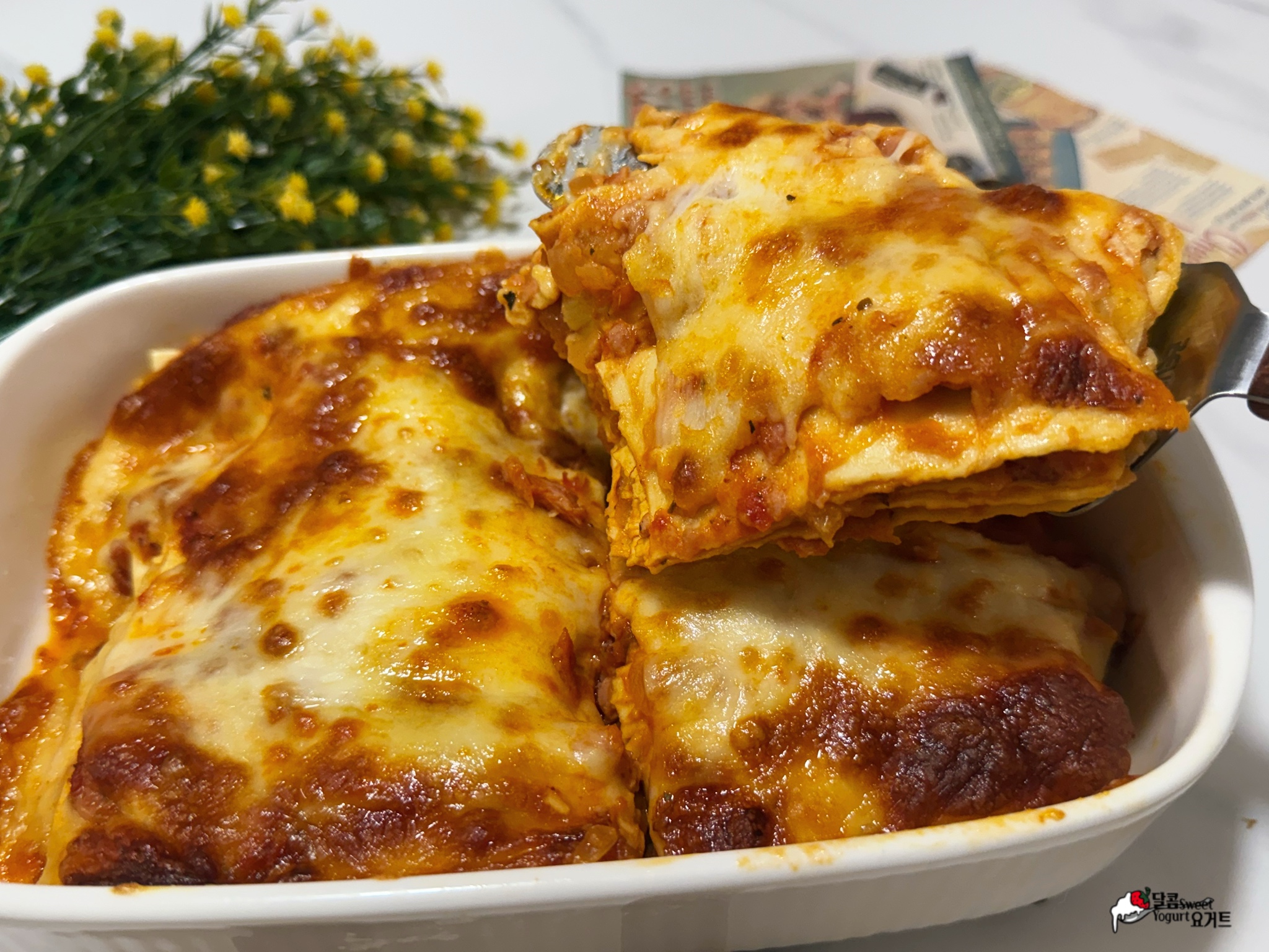 이탈리아 파스타 요리 중 하나인 라자냐는 직사각형 넓은 면과 소스, 치즈를 층층이 쌓아 오븐에 구워 먹는 요리입니다.