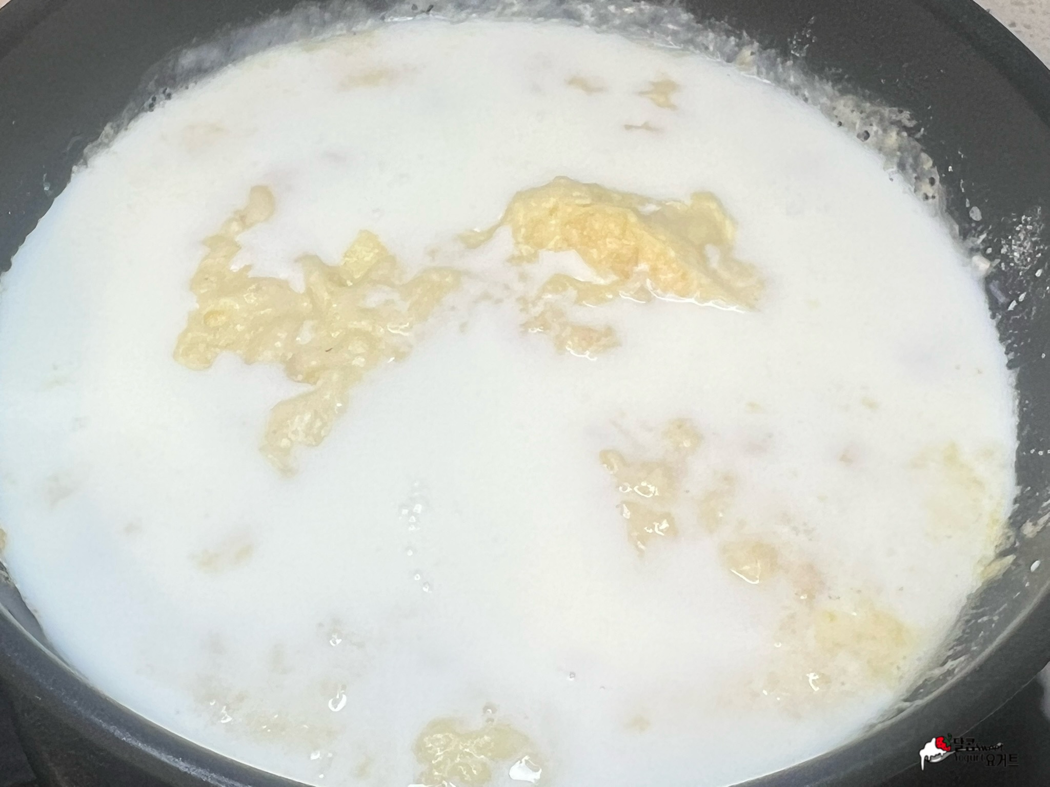 우유 300ml은 2~3번 나눠 넣으면서 잘 풀어가며 끓여줍니다.