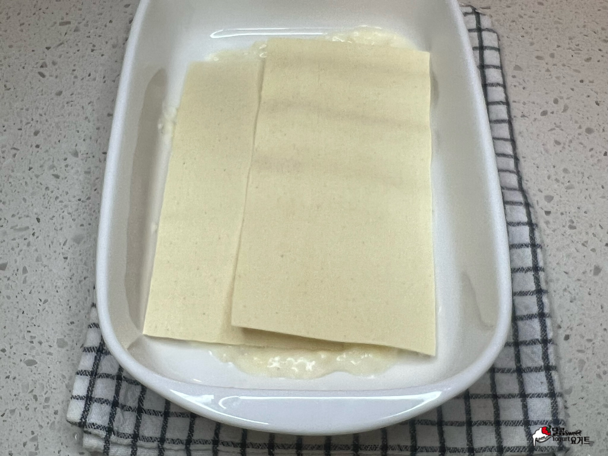 오븐 용기를 준비해 주고 베사멜 소스를 살짝 펴 발라준 후 라자냐면을 올려줍니다.