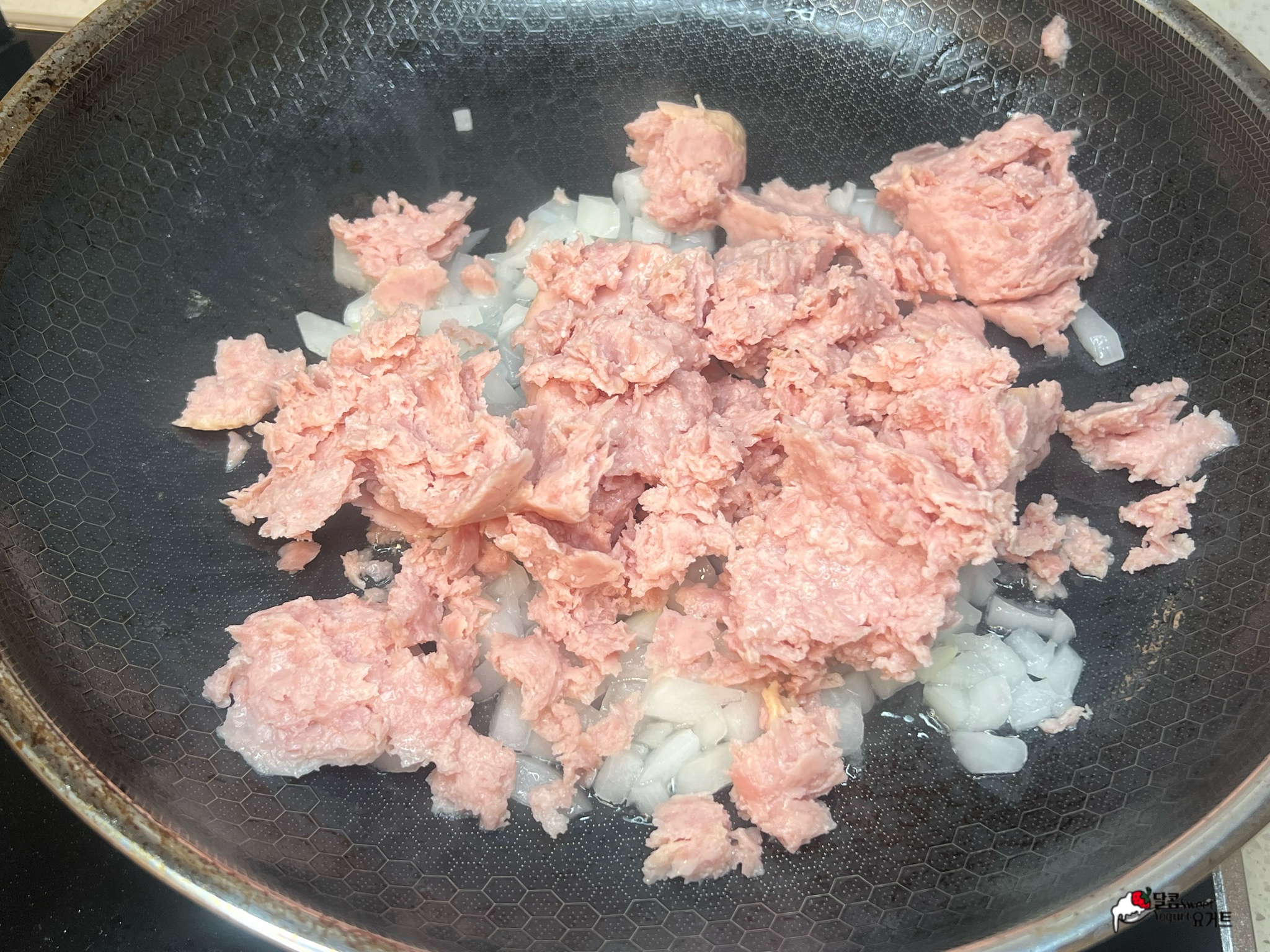 양파가 투명해지기 시작하면 스팸을 으깨 넣고 함께 볶아줍니다.