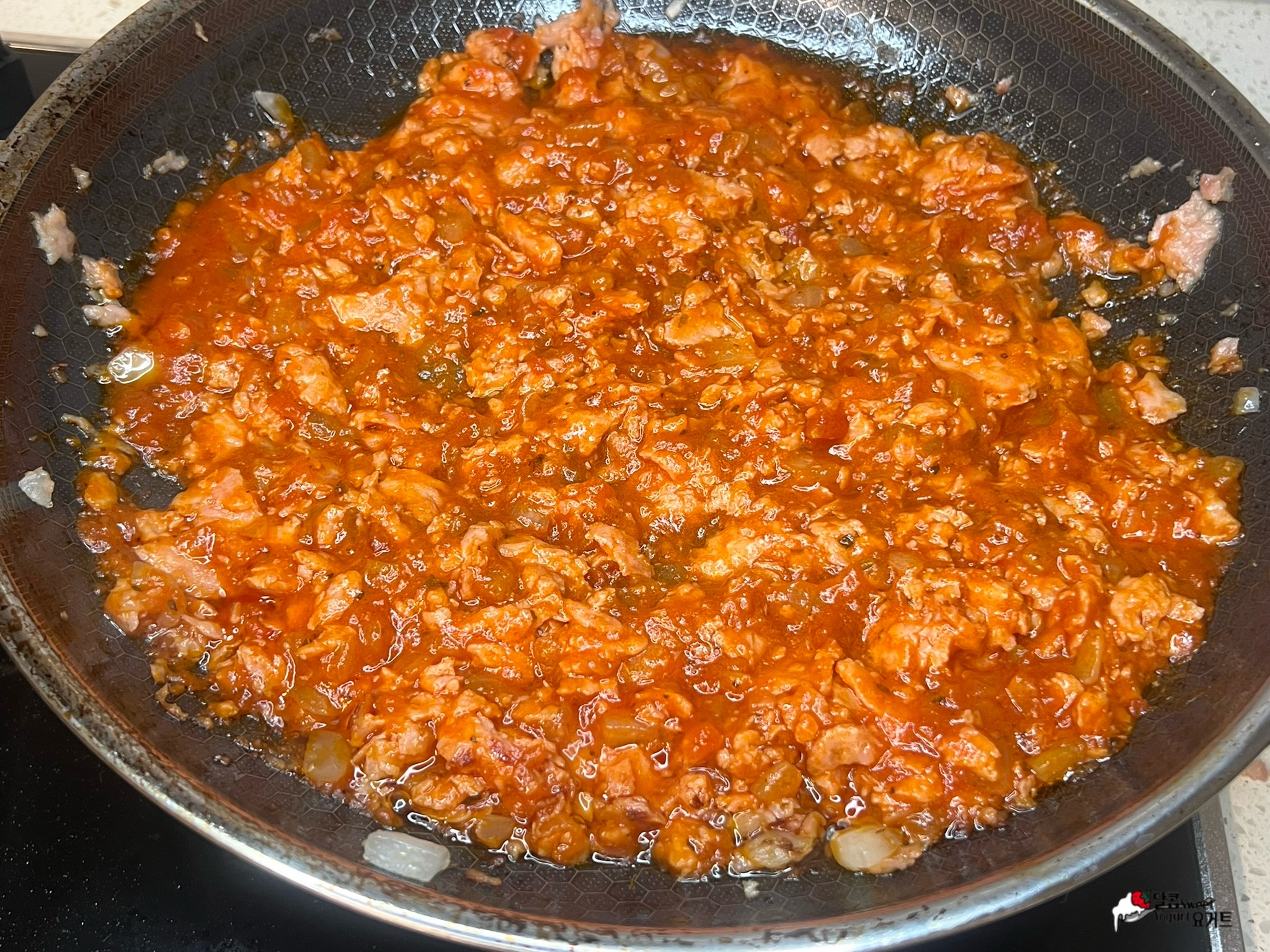 또한 라구소스에 보통 소고기를 넣고 만들지만 더욱 간단하게 만들기 위해 스팸을 으깨 더해 보았습니다.