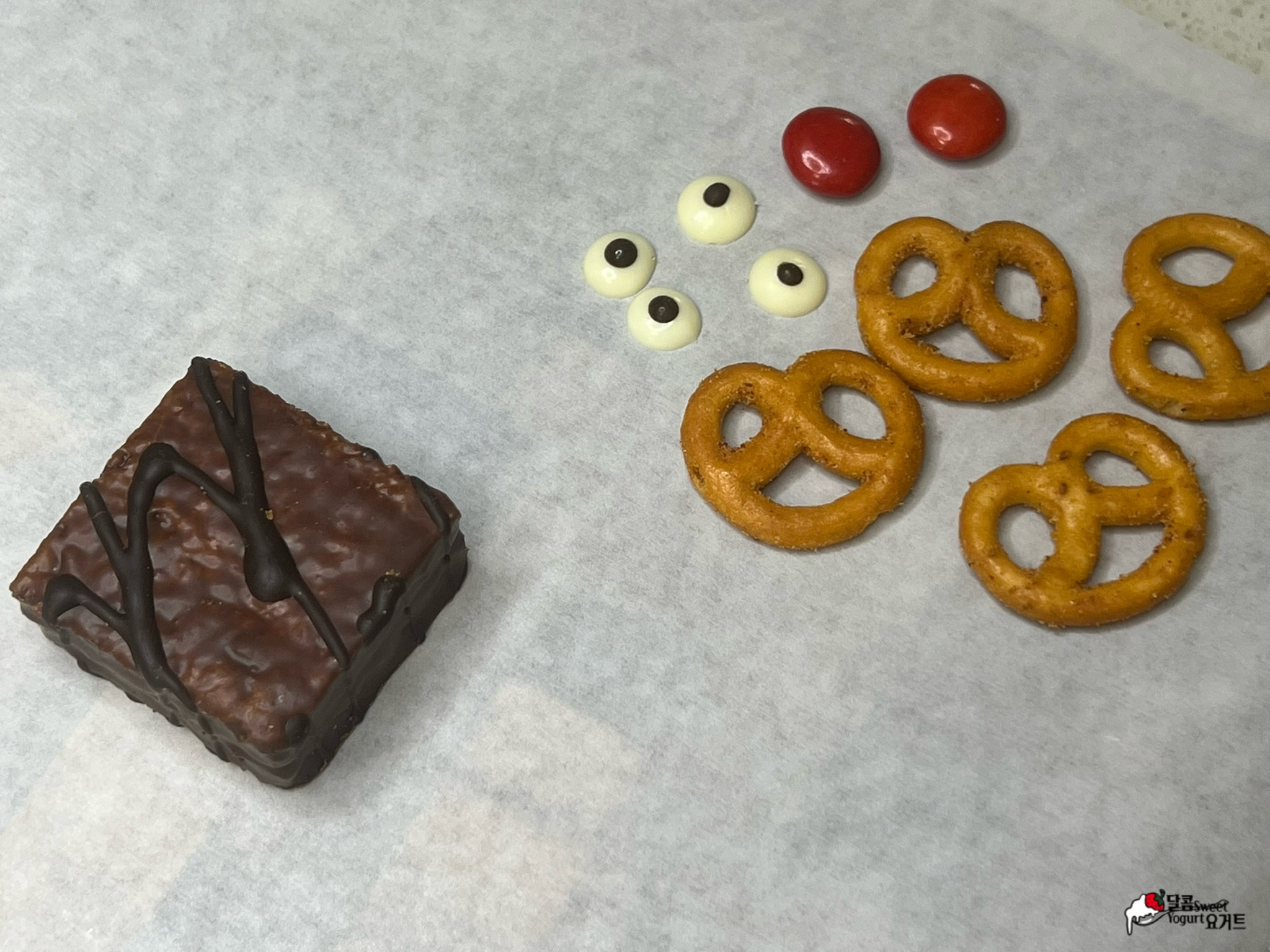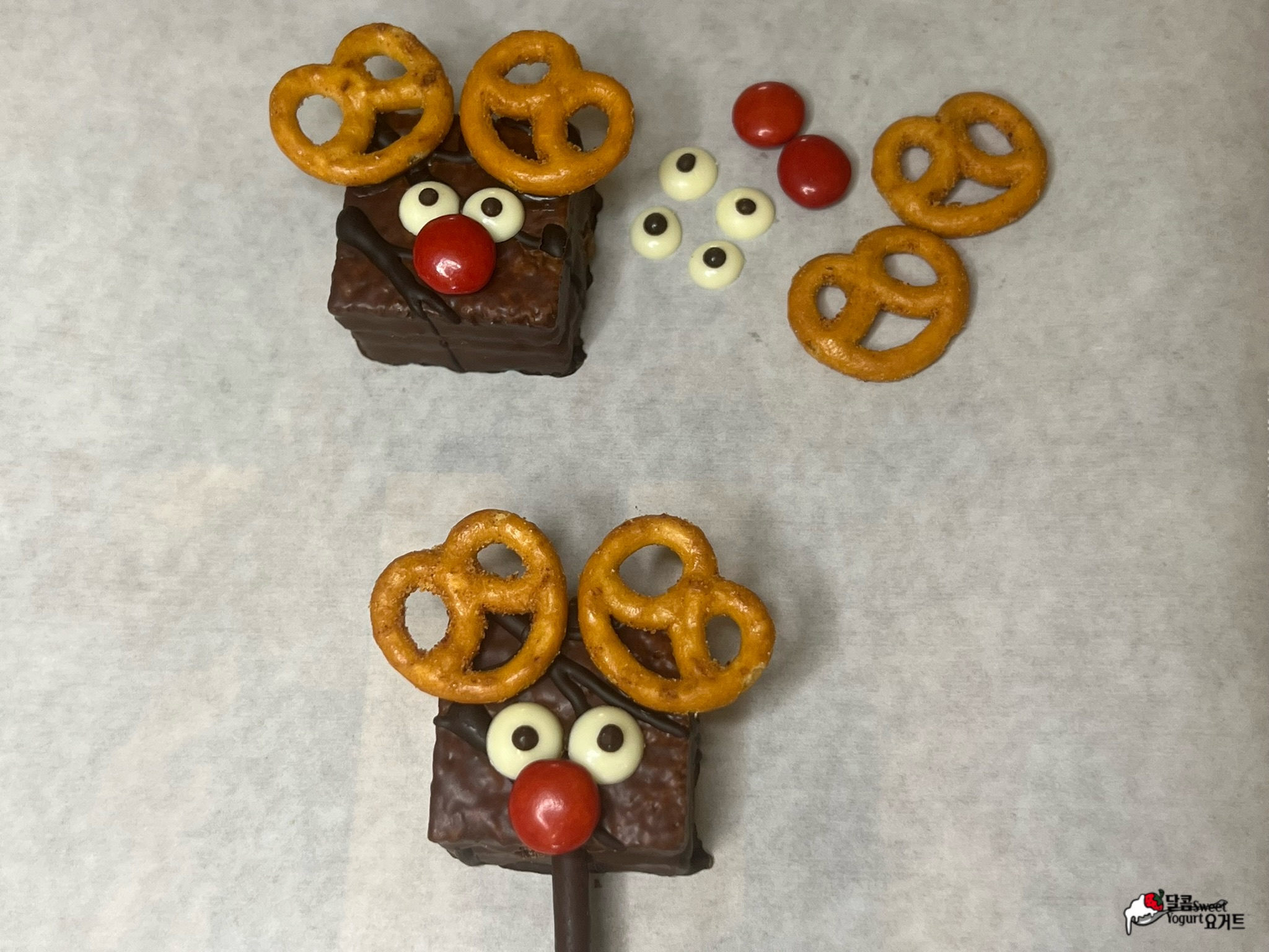 미니 오예스 위로 초콜릿을 발라준 후 프레첼(루돌프 귀), 초코 눈, M&M 초콜릿(루돌프 코)을 붙여줍니다.