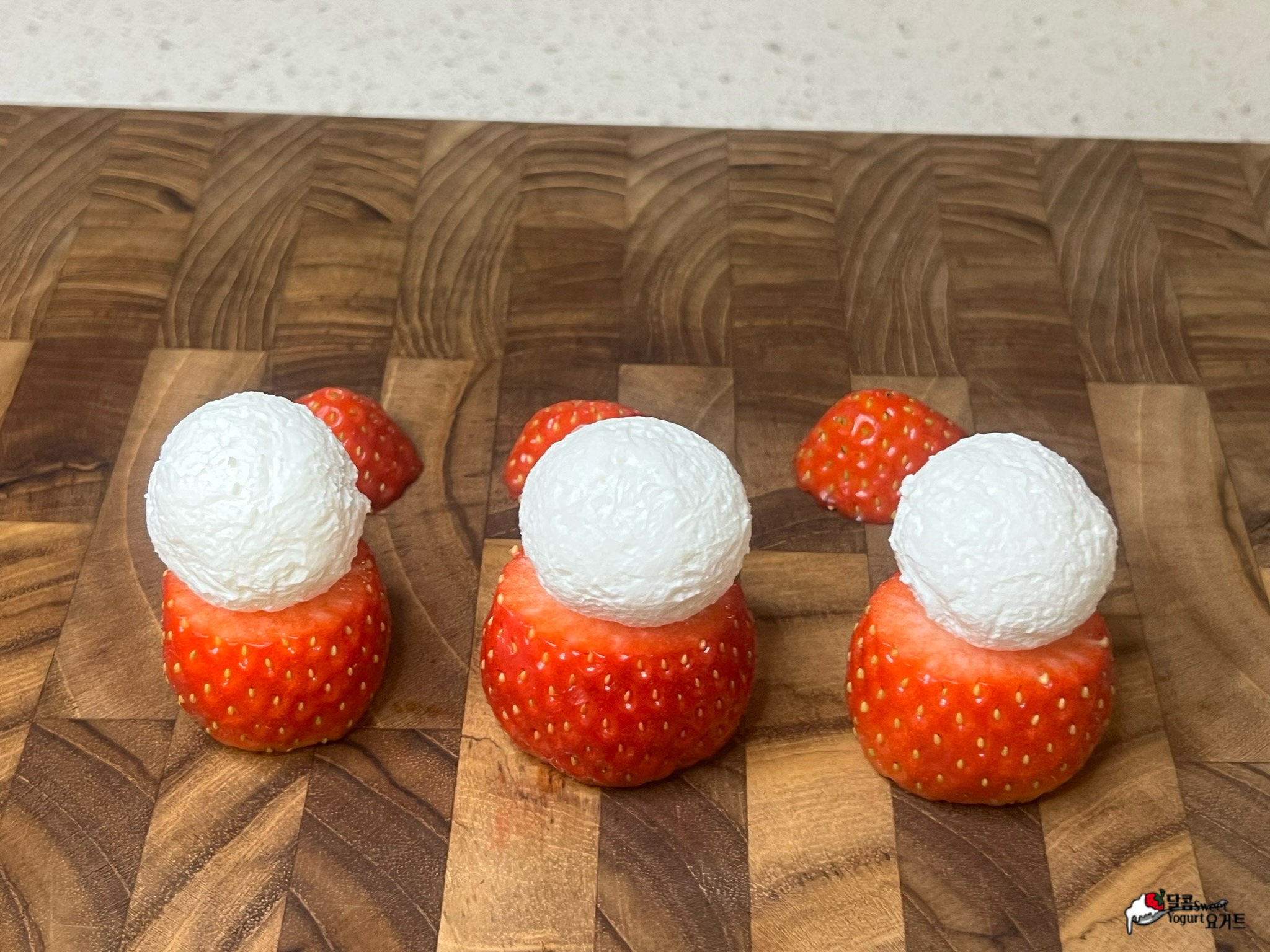 딸기 몸통 위로 그릭요거트를 올려주고 딸기 모자를 씌워줍니다.