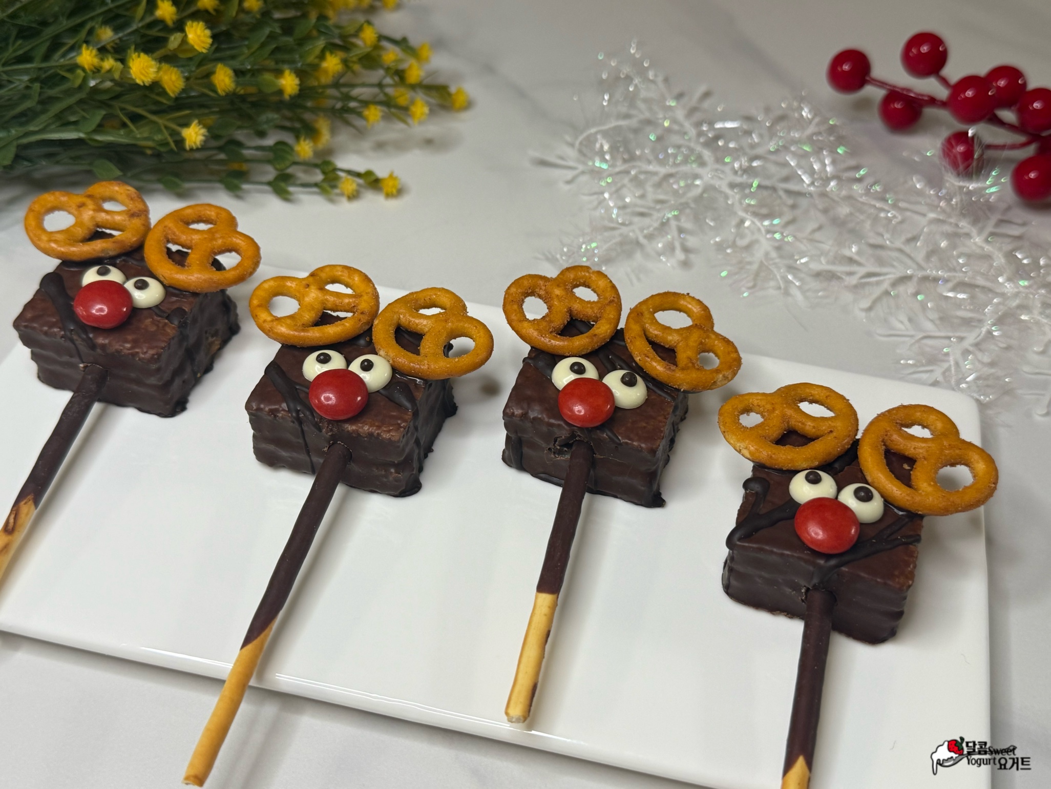 빼빼로 조심스럽게 꽂아주면 초간단하게 완성이 되는 오예스 루돌프입니다.
