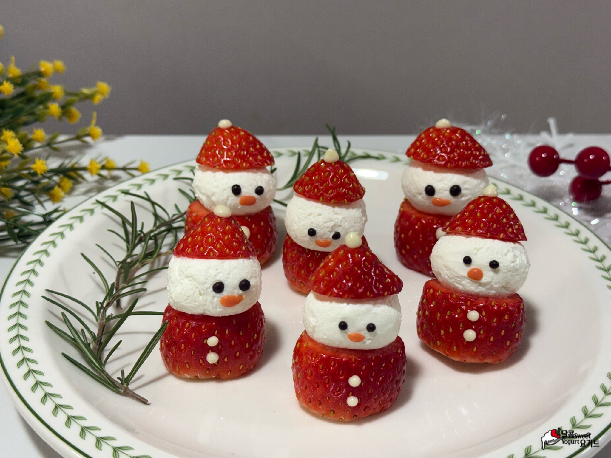 초코펜으로 눈, 코, 단추, 모자방울까지 그려주면 최종 완성이 되는 딸기산타입니다.