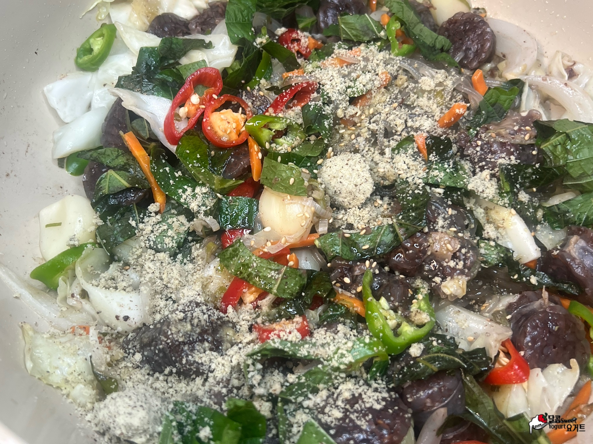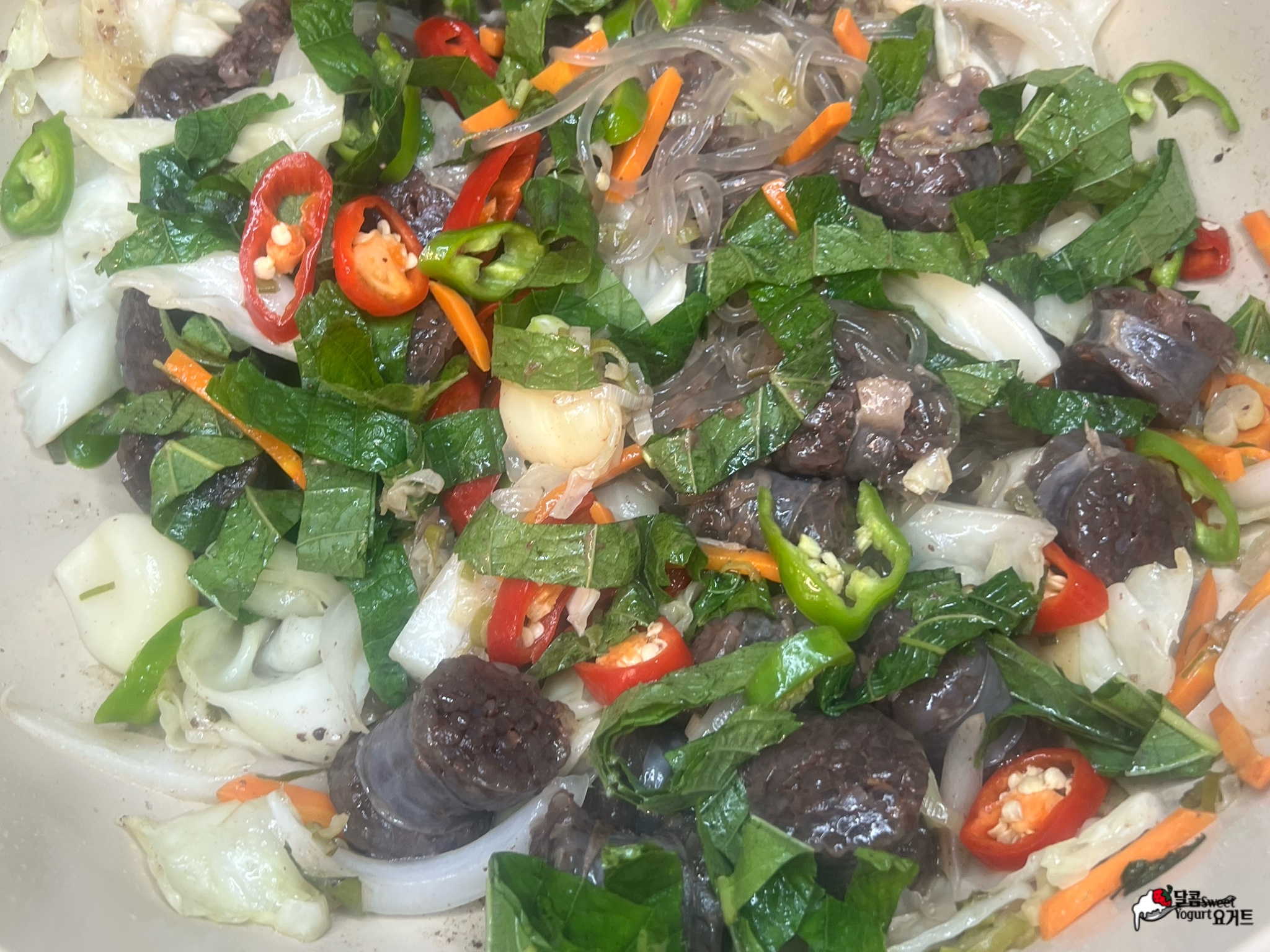 고소한 들깨향이 솔솔~~ 쫄깃한 순대와 아삭아삭한 채소~ 여기에 매콤 새콤 오묘한 맛의 양념장 소스까지!!