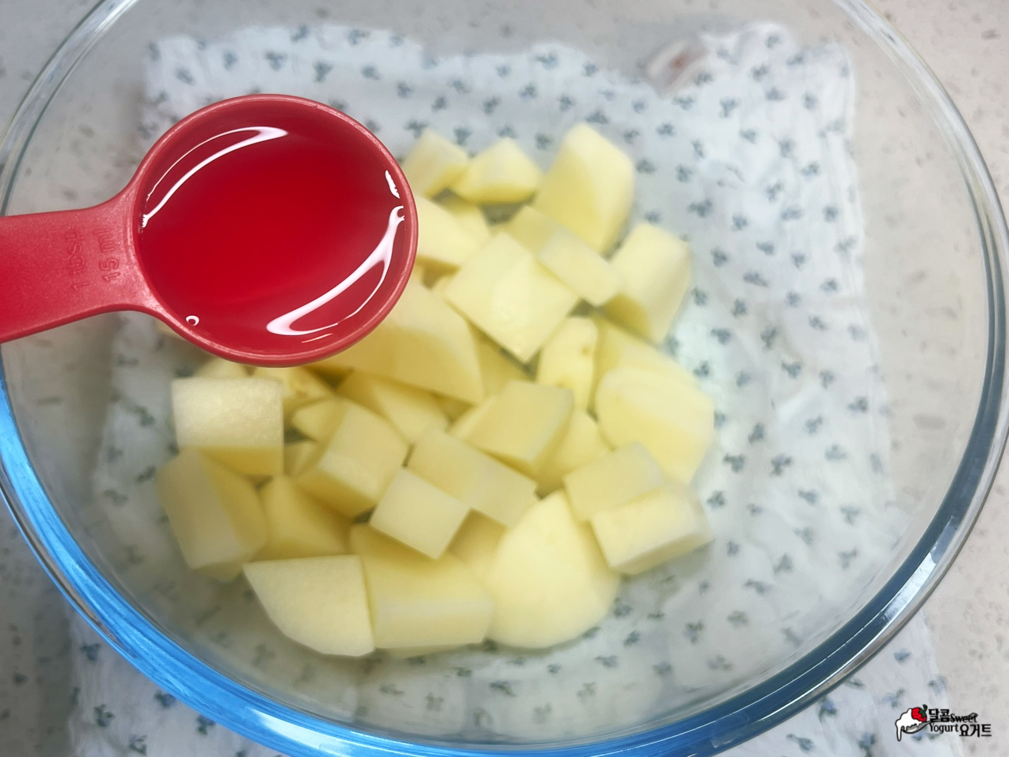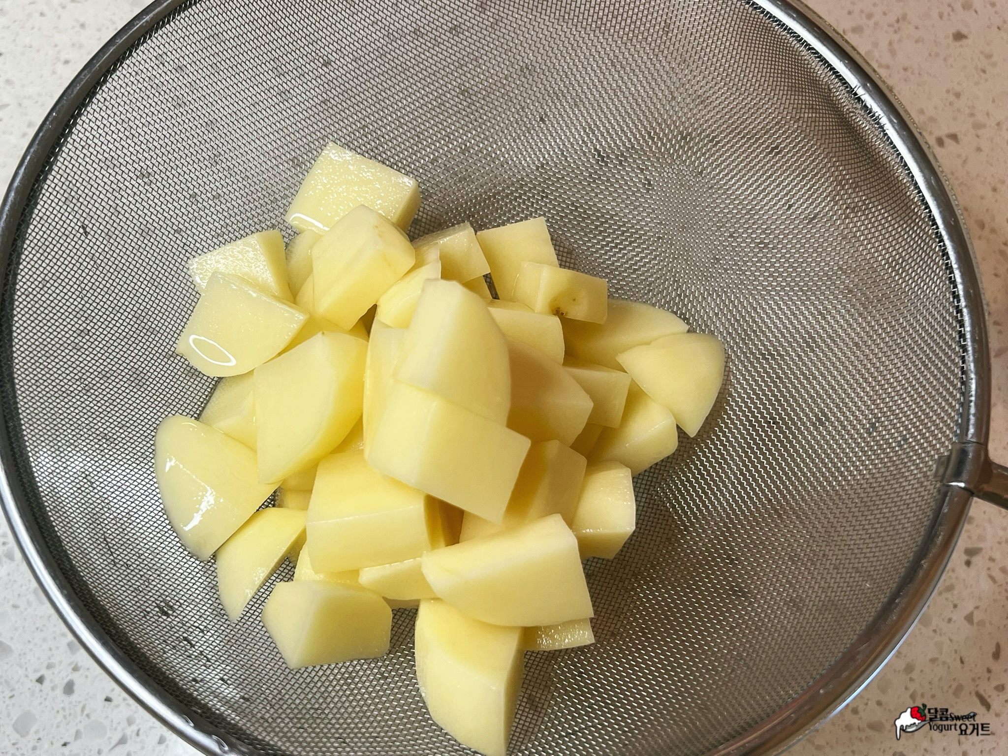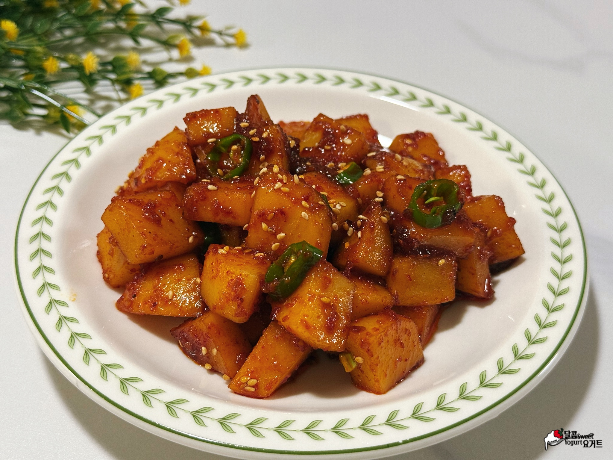 감자 특유의 포슬포슬한 식감 대신 물엿으로 절여 쫀득한 식감을 최대한 살려보았습니다.