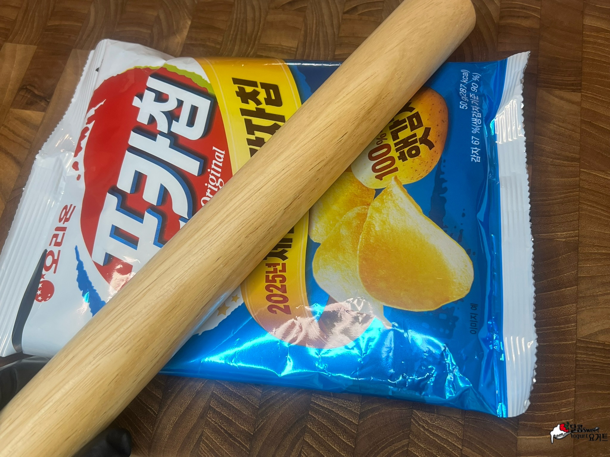 포카칩 과자를 준비해 살짝 뜯어준 후 밀대를 이용해 막 부셔줍니다.