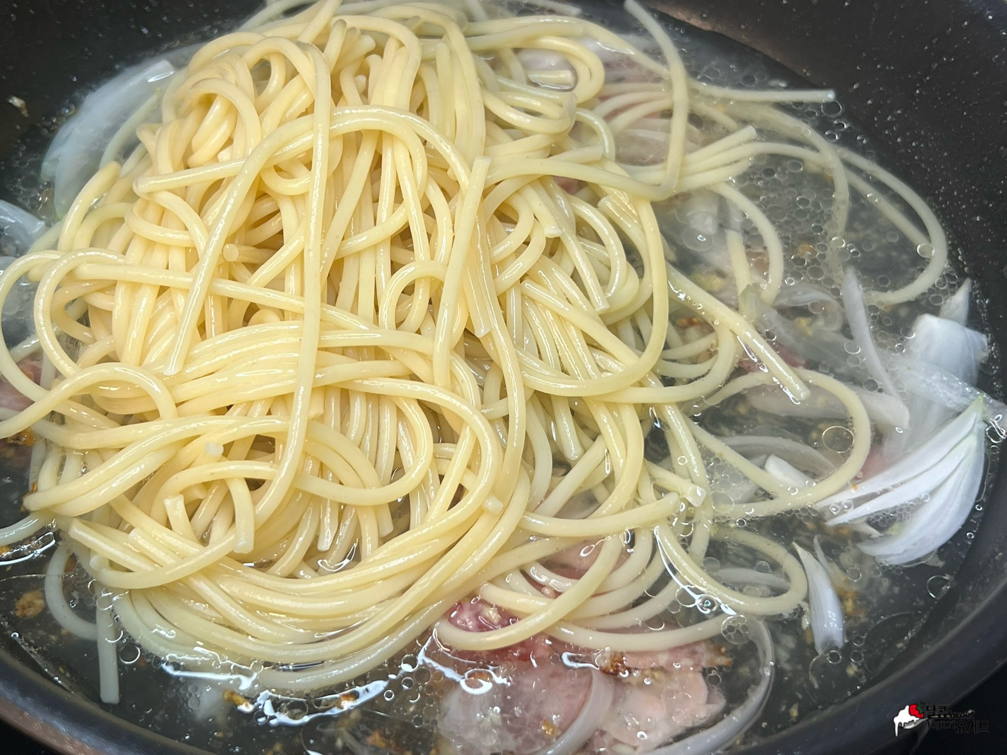 삶은 스파게티면을 모두 넣고.