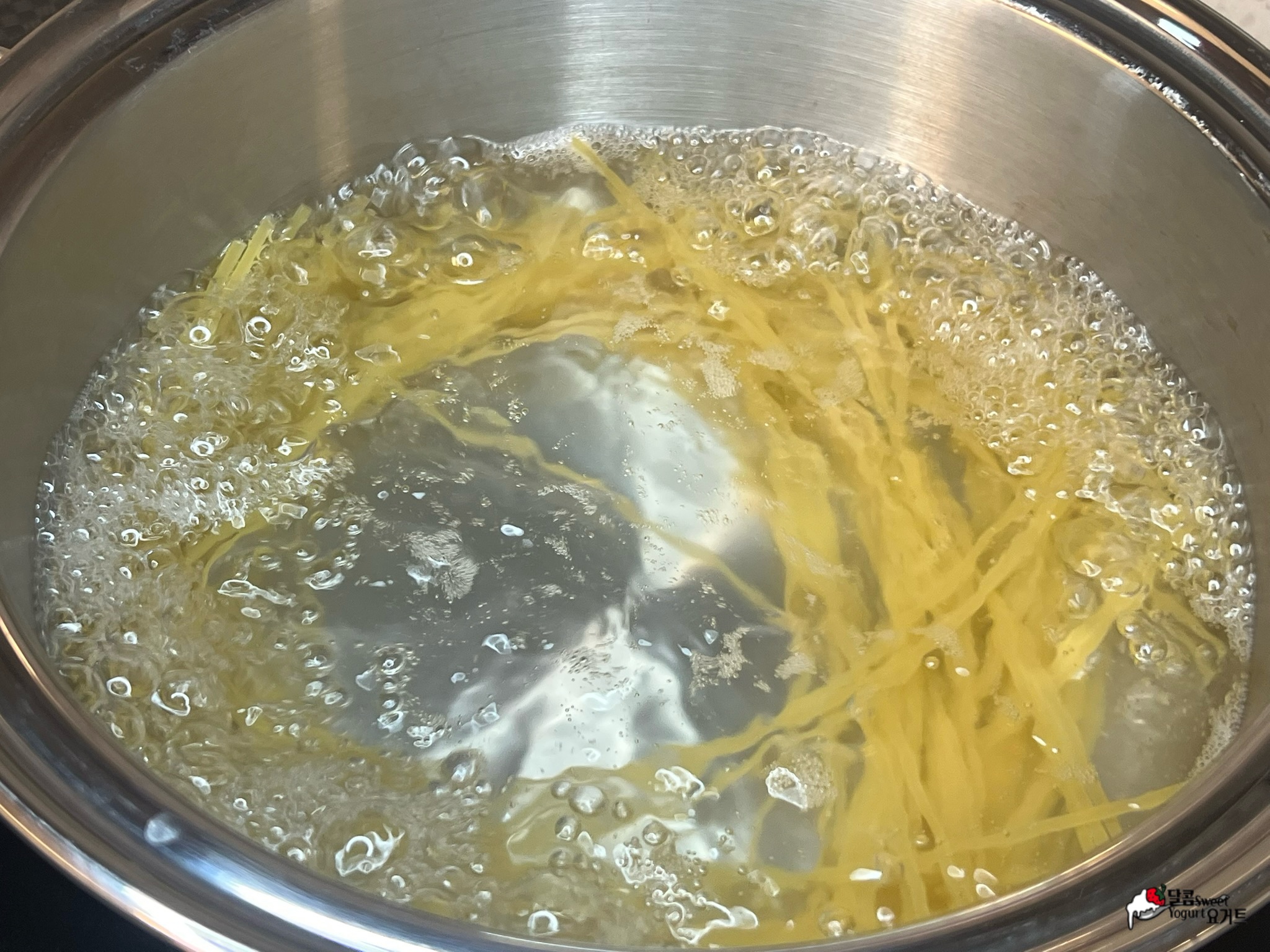 스파게티 면 100g은 끓는 물에 약 8분 삶아줍니다.