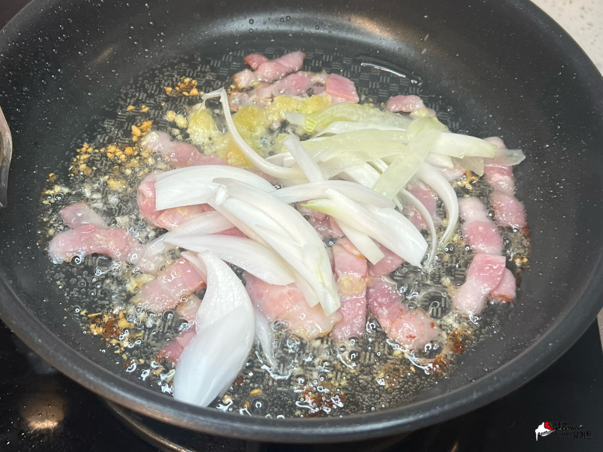 팬에 기름을 넉넉하게 두르고 다진 마늘 1스푼, 베이컨을 잘게 썰어 넣고 볶다가 채 썬 양파를 넣고 함께 볶아줍니다.