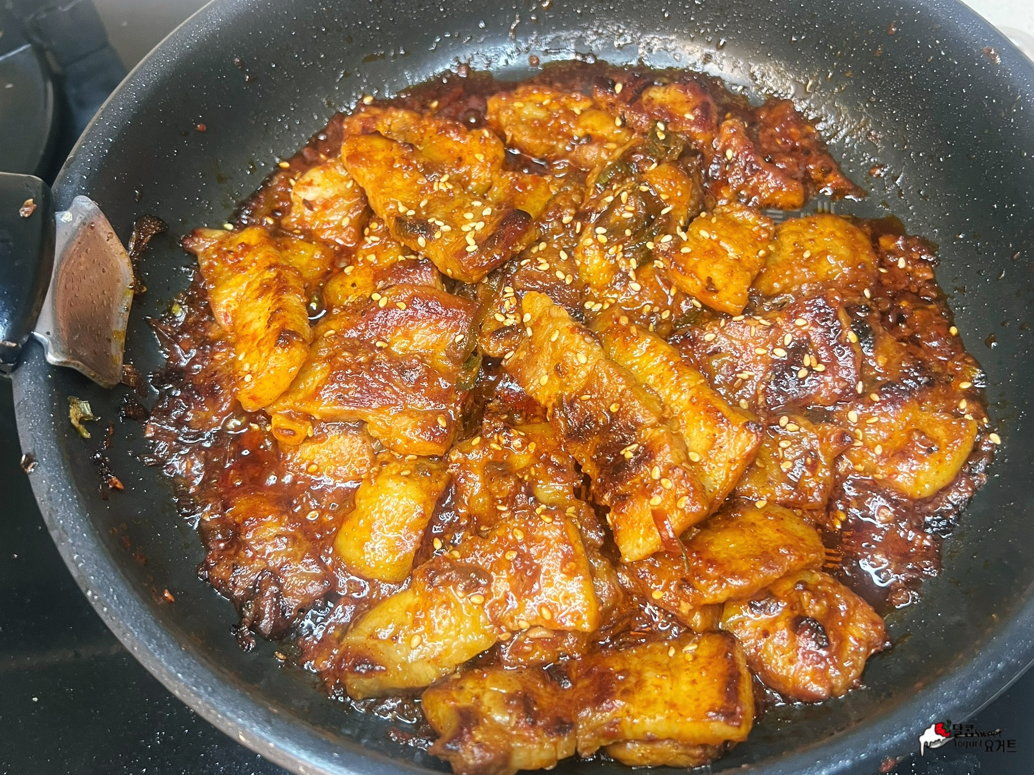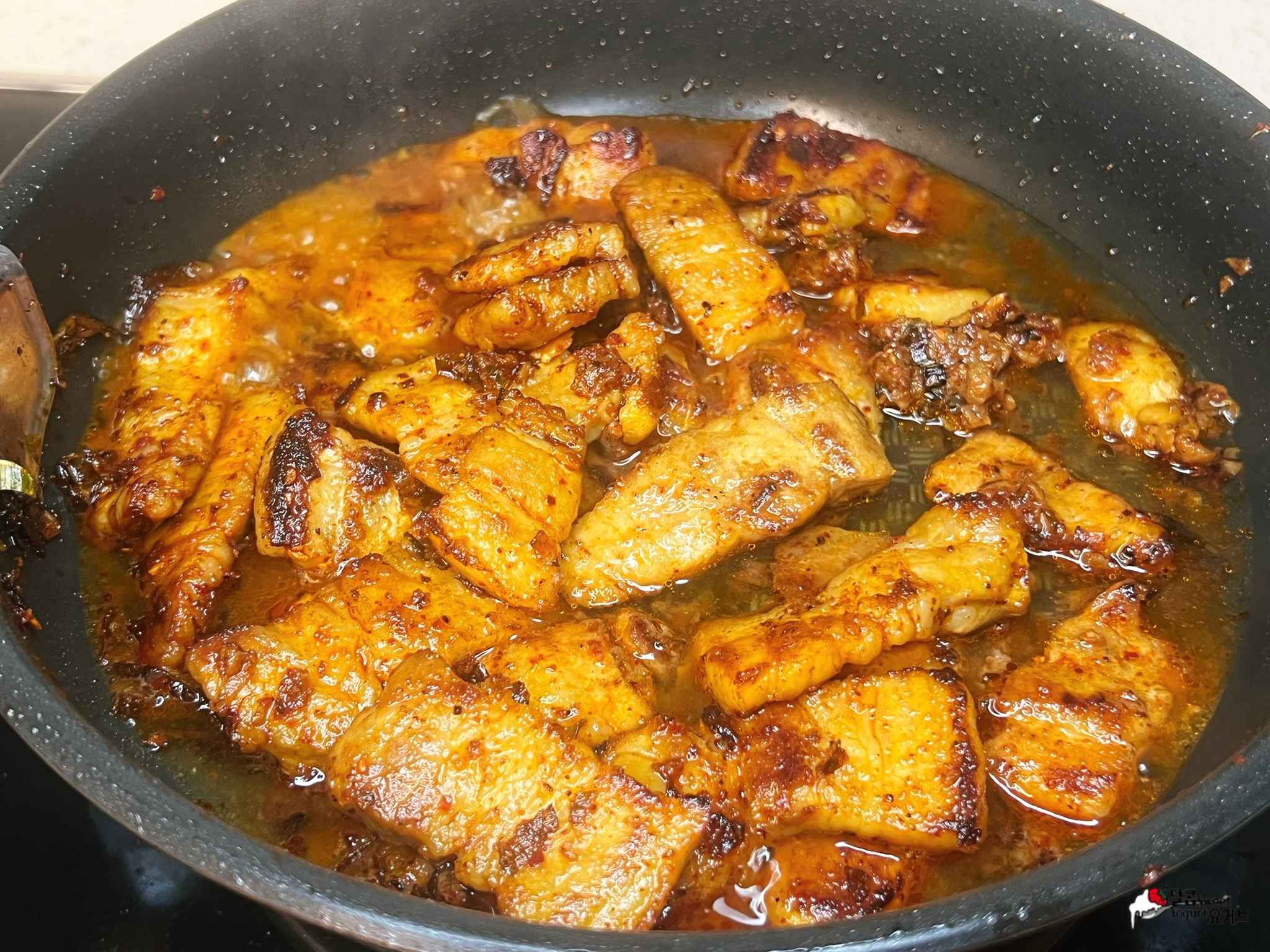 삼겹살을 노릇하게 구워준 후 된장베이스의 소스에 볶아주면 끝.