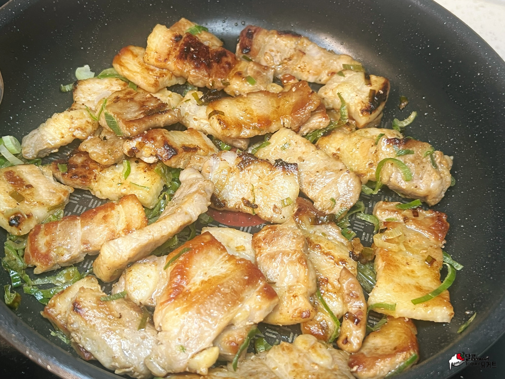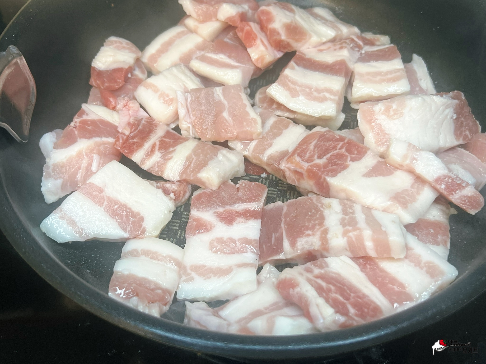 예열한 팬에 삼겹살을 올려 소금 조금 더해 노릇하게 구워줍니다.