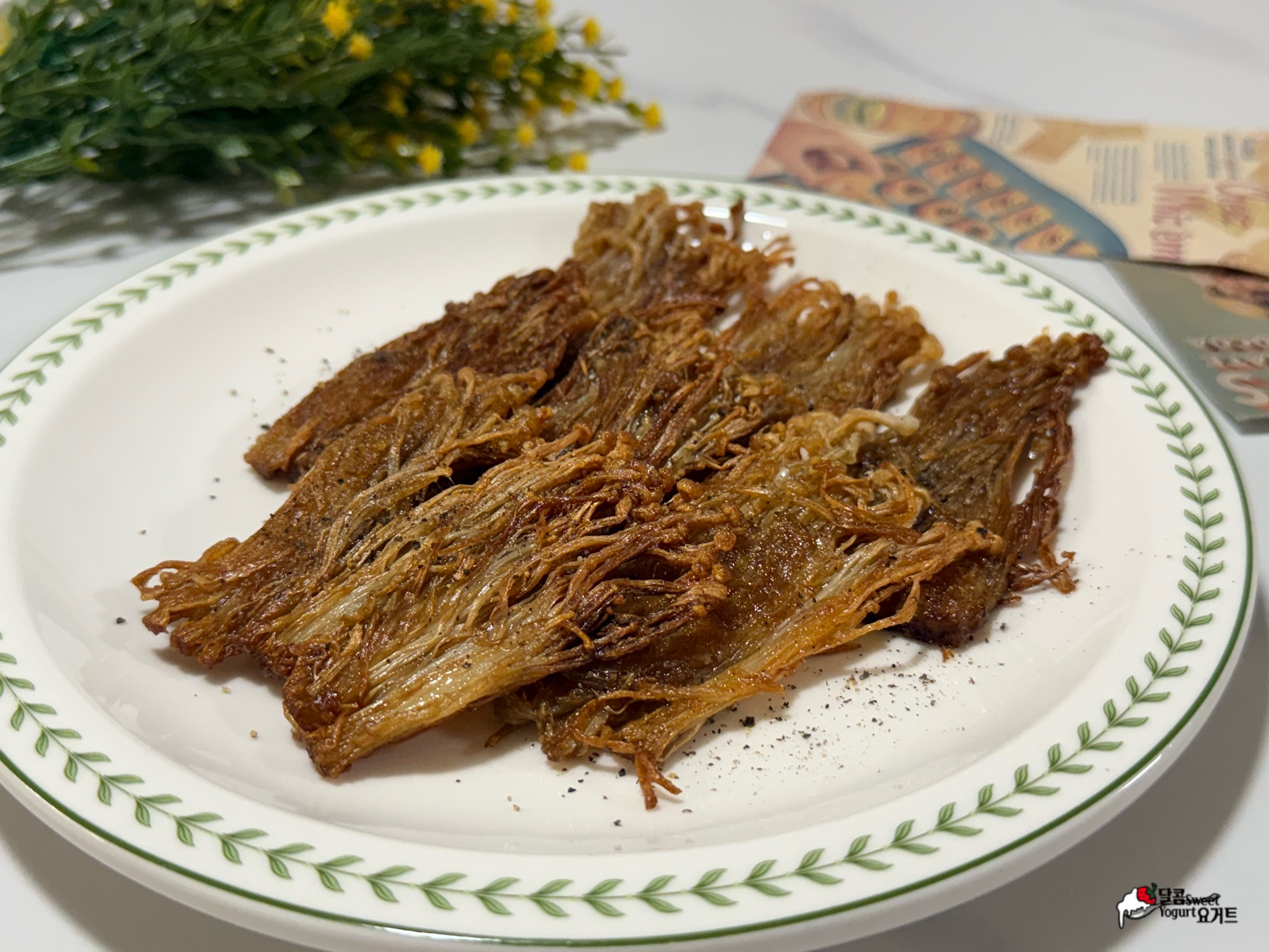 이번엔 팽이버섯을 활용해 튀김을 만들어 보았더니 평소 먹던 오독오독 씹히는 식감 대신 바삭바삭하니 과자 같은 느낌으로 더욱 맛있게 먹을 수 있었습니다.