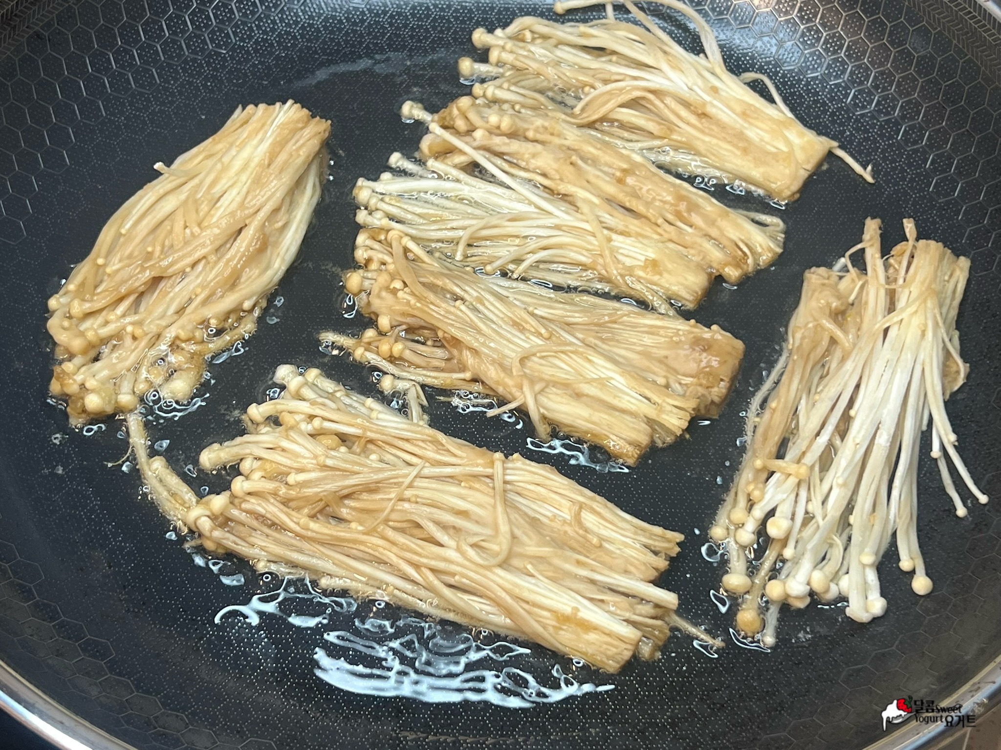 기름 넉넉하게 두른 팬에 팽이버섯을 넣고.