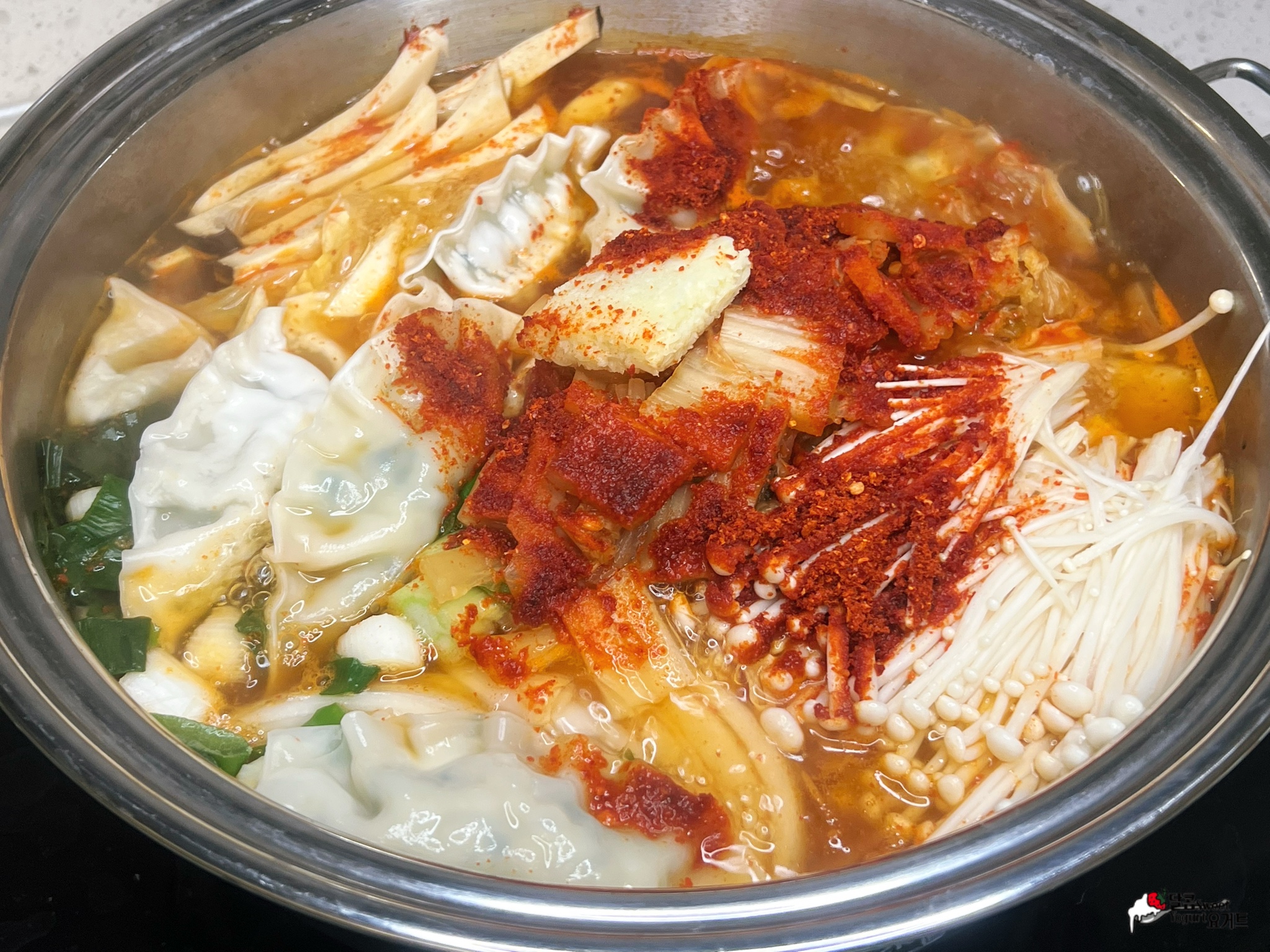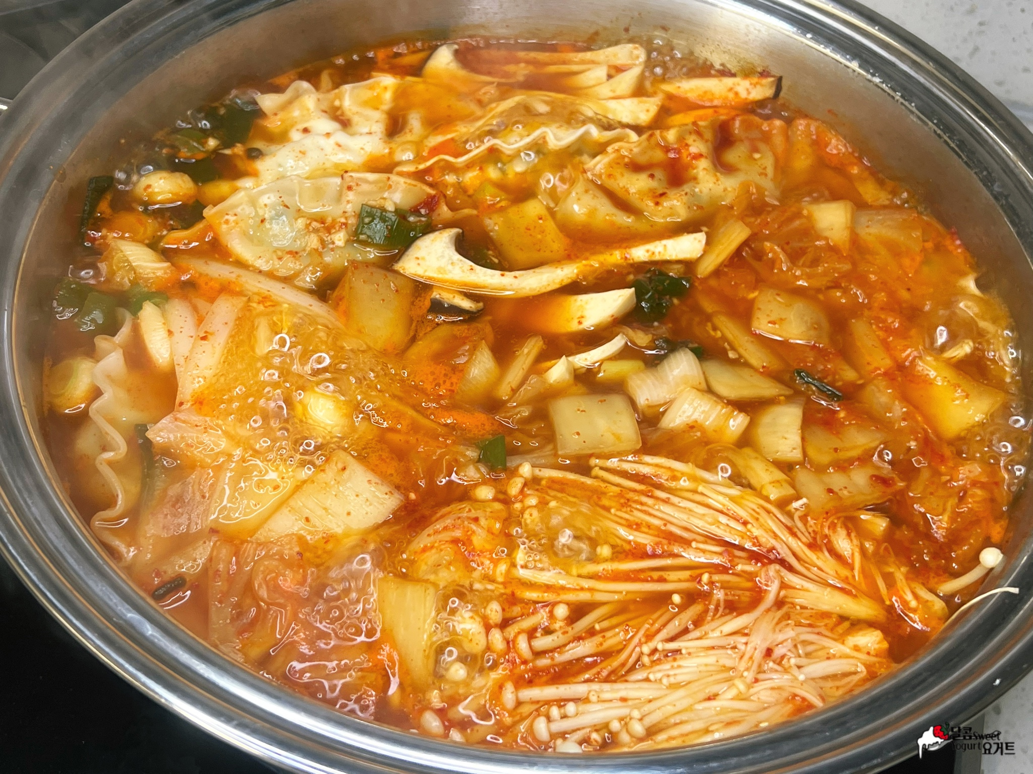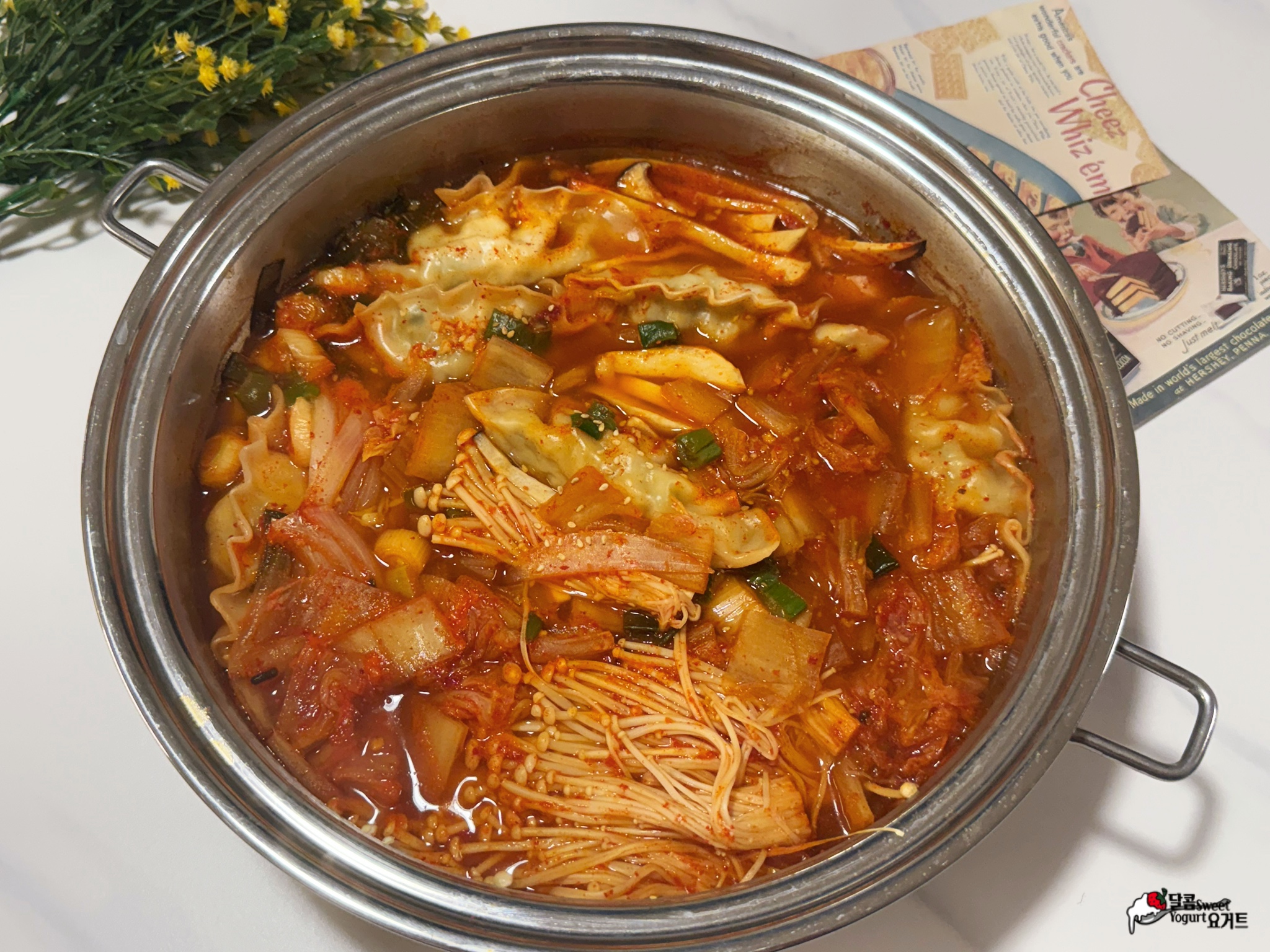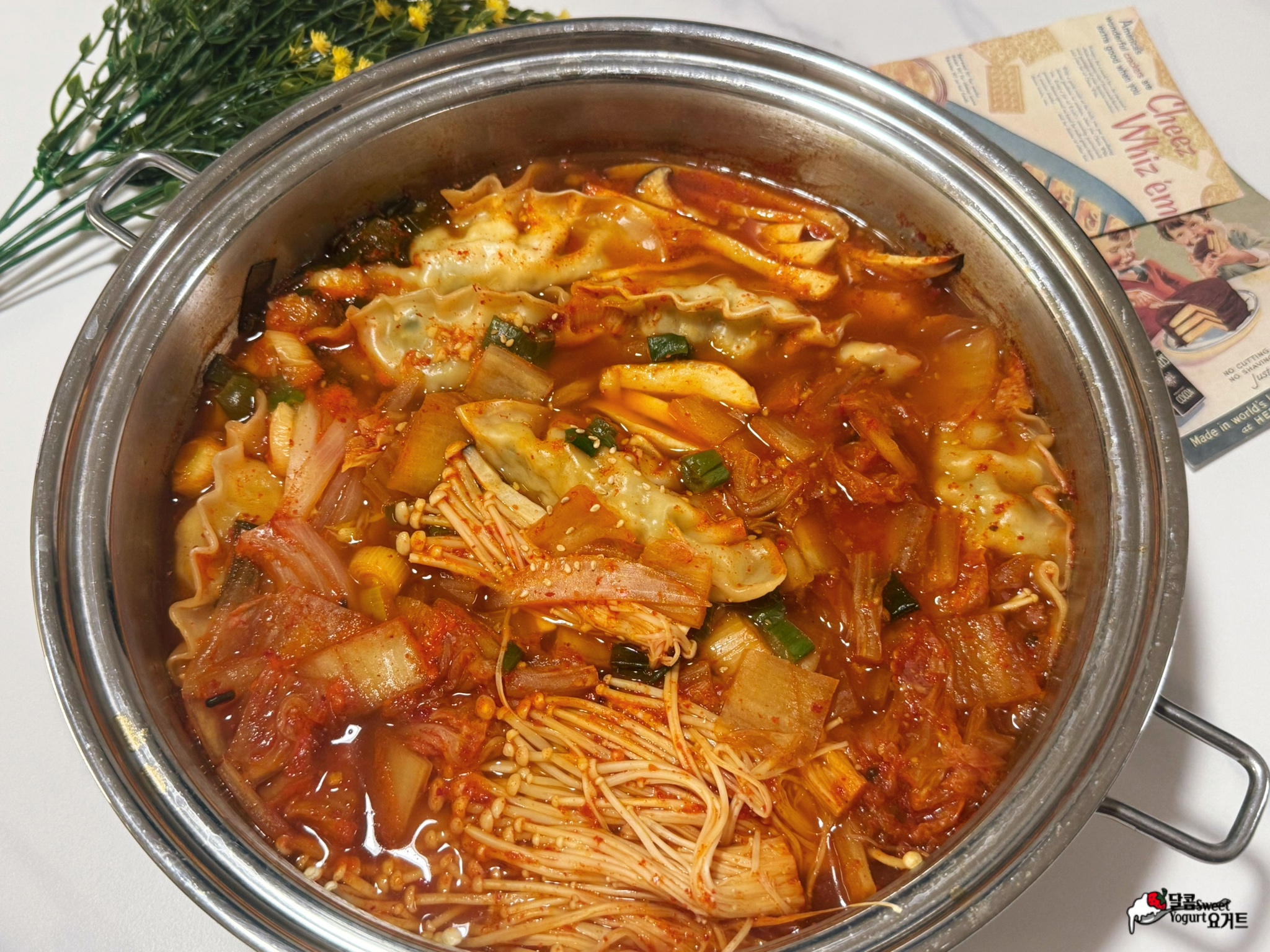 이렇게 하여 최종 완성이 된 김치 만두전골입니다.