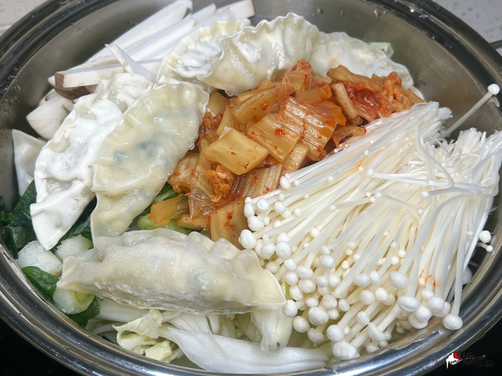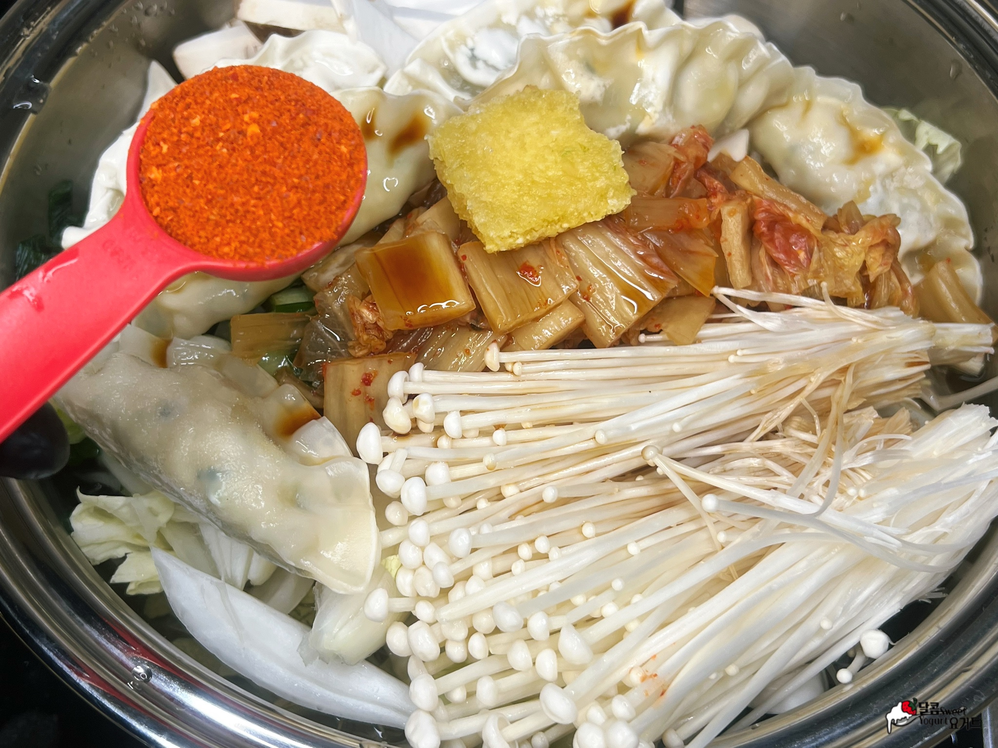 만두 8개와 준비한 재료 양파, 새송이버섯, 팽이버섯, 대파, 신김치 1줌 잘라 넣어줍니다.