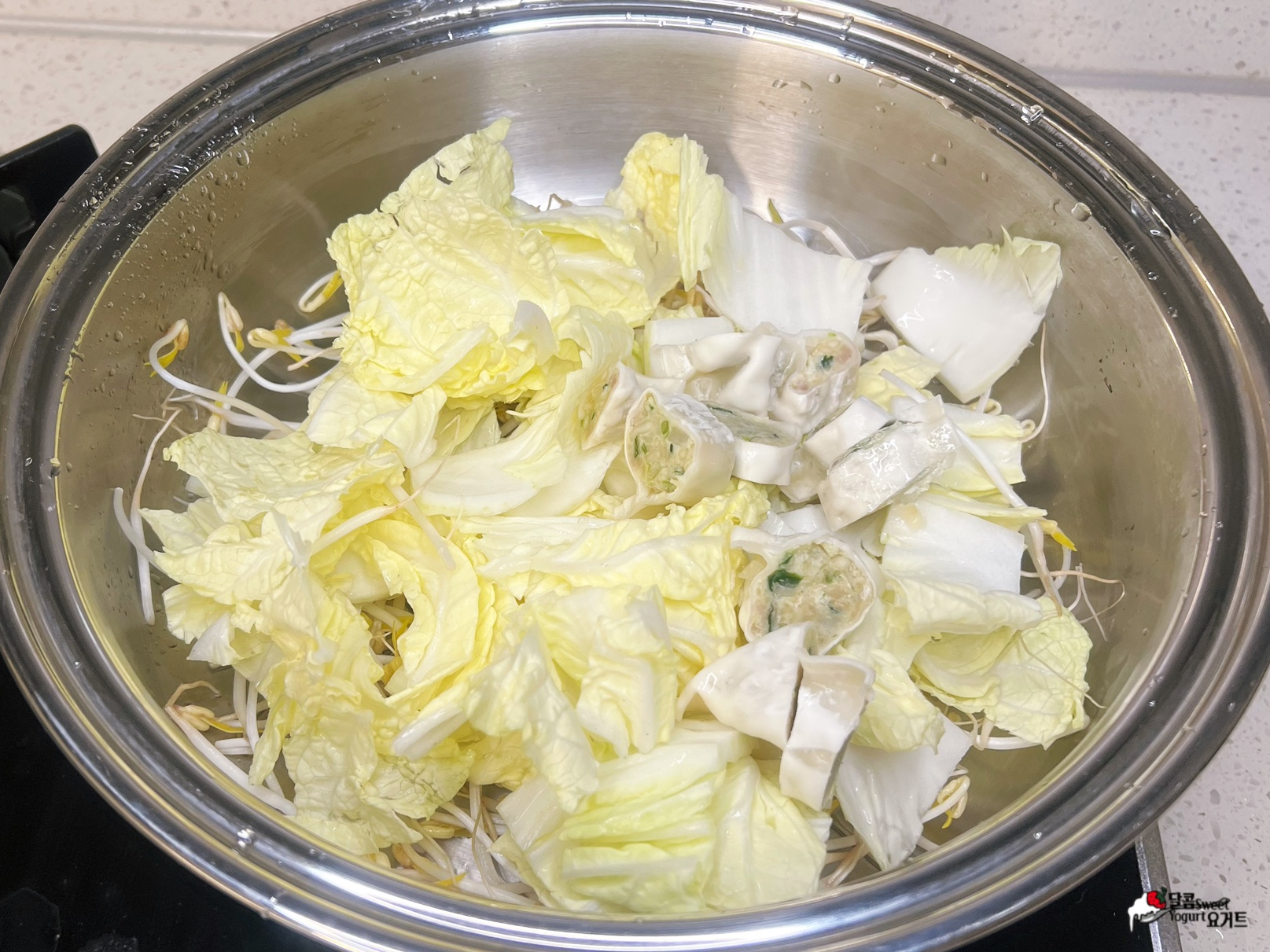 먼저 만두전골에 들어갈 채소들을 손질해주고 냄비바닥에 숙주, 배추를 깔아줍니다